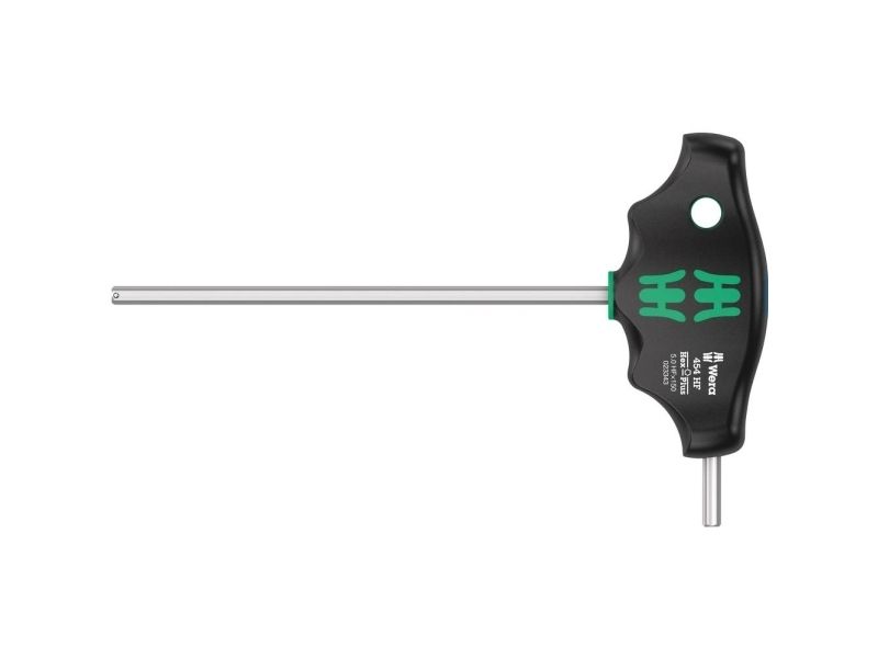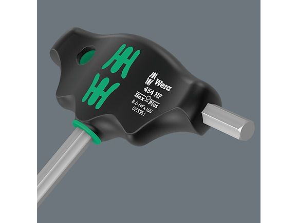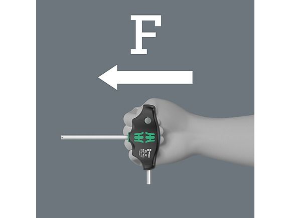 T-handle screwdriver: The ideal handle shape to allow high torque transmission in difficult tightening and loosening situations. The ergonomic shape of the handle fills the palm of the hand well, the fingers lie safely in the soft rounded handle recesses. The whole hand makes contact with the handle and friction losses between the hand and the handle are avoided. With holding function (HF) to securely hold the hexagon socket screw on the tool. Special surface treatment of the blades for high corrosion protection and an optimum fit in the screw head.