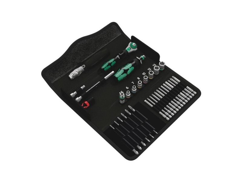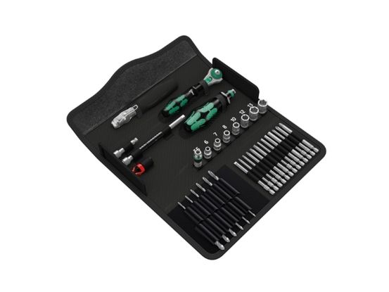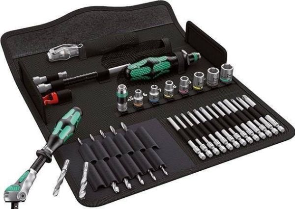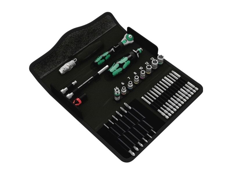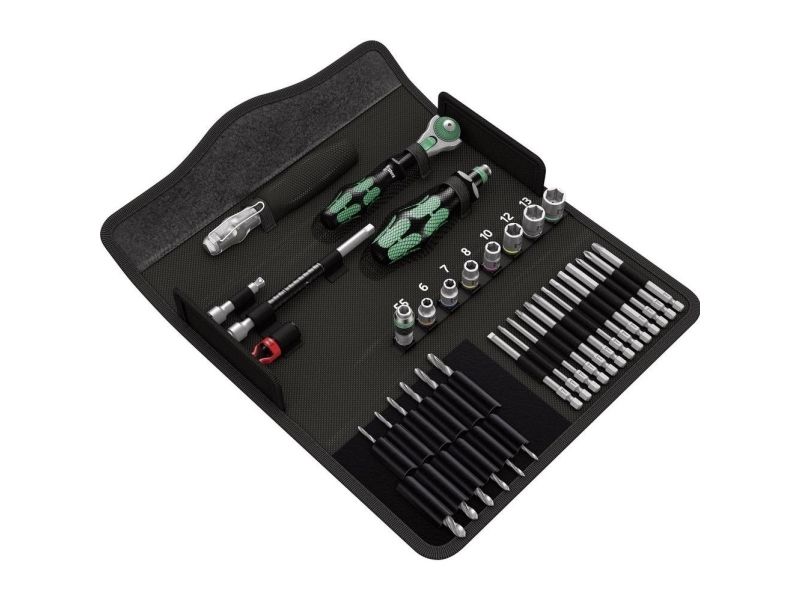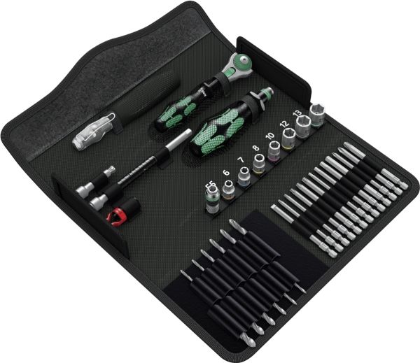 Compact tool set with the 39 most important screwdriving tools for jobs on metal. Includes the incredibly fast 1/4" Zyklop Speed ratchet and accessories; 7 manual and power tool sockets, sizes 5.5-13, 1 universal bit holder; 13 bits in a length of 89 mm; 6 metal twist drill bits with diameter of 3-10 mm; 1 screw gripper for firmly holding screws; 1 voltage tester 247; textile box, very robust and durable; can be positioned upright in the workshop shelf for convenient storage; additional surface protection thanks to the textile outer material; low weight and volume for simplified mobility.