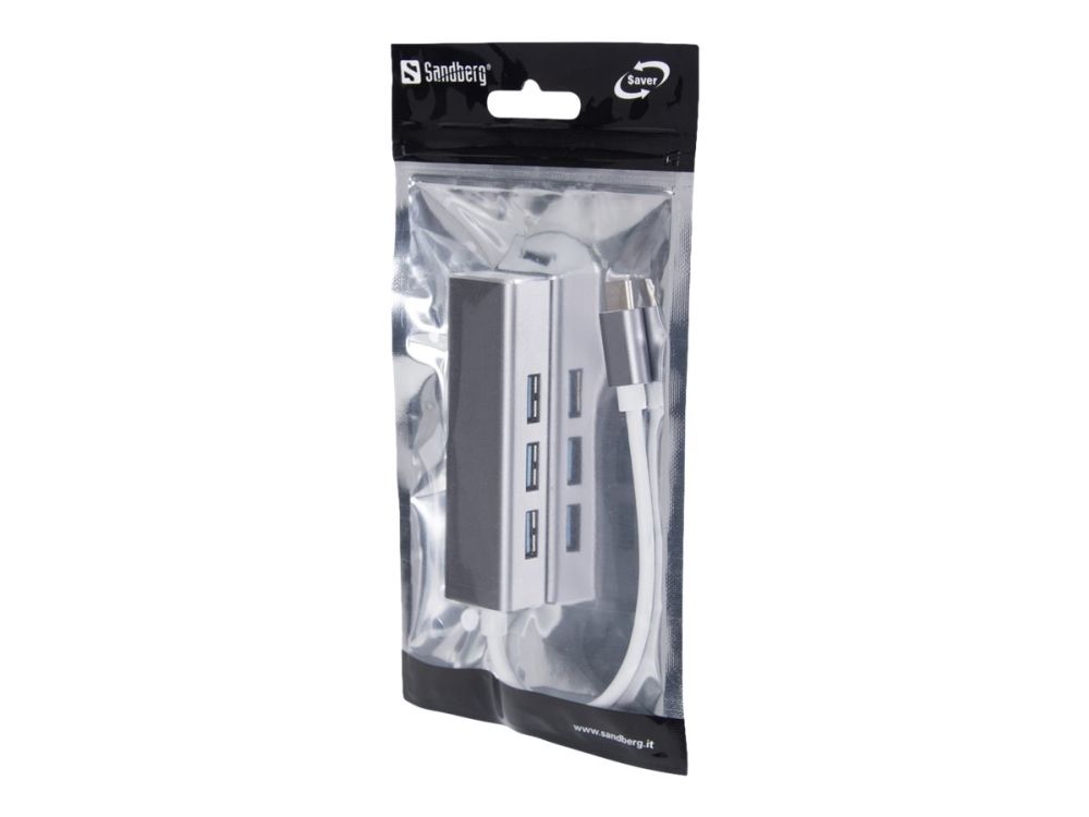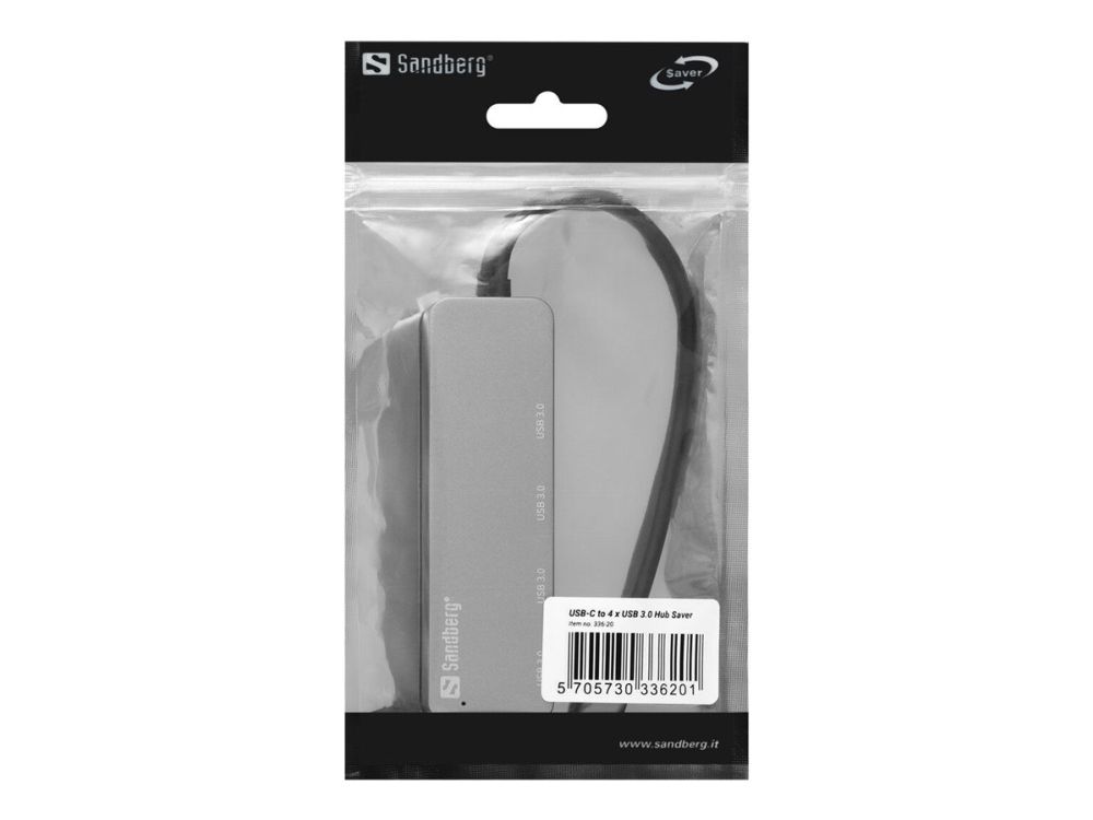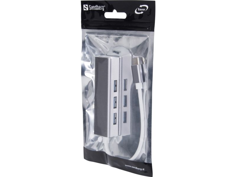 The Sandberg USB-C to 4 x USB 3.0 Hub Saver allows connection of up to 4 USB devices to your device with USB-C port. Thus you can for example connect an external hard disk, a printer and a mouse simultaneously.