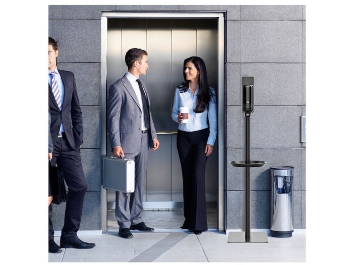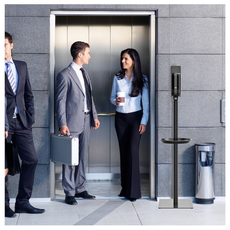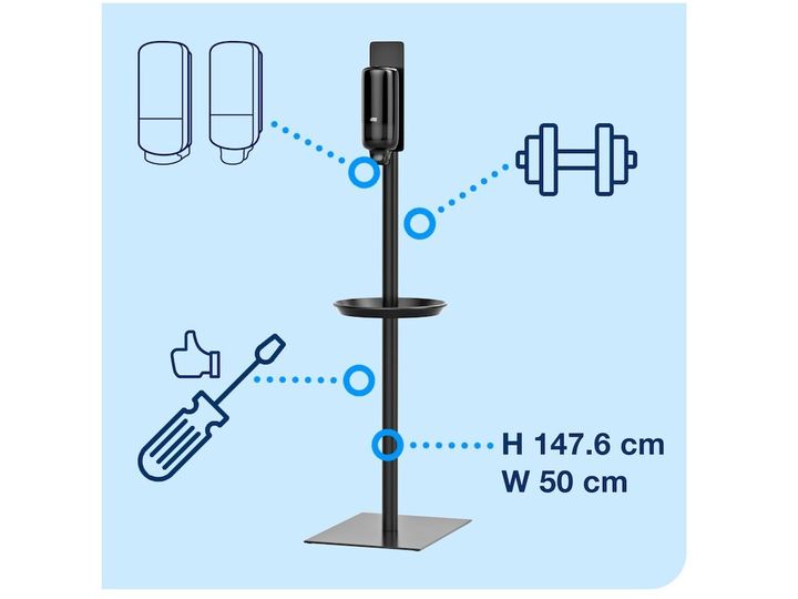 The Tork Sanitiser stand keeps hand hygiene top of mind and accessible for employees and customers when no water is available. Suited to many different environments and public areas, the stand offers flexibility to move and position hand hygiene solutions where needed most. Dispensers are available separately.