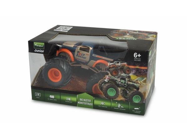 Der Big Buster von Amewi ist ein cooler Monstertruck mit überdimensionierten Reifen. Hohe Bodenfreiheit, tolle Lackierung und einfache Bedienung sind nur ein paar der Eigenschaften die dieser Monstertruck besitzt. Das 2WD Modell wird mit Akku, Ladekabel (USB) und Pistolensender 2,4Ghz ausgeliefert. Der 500mAh Akku 3,7V LiIon sorgt dabei für Fahrzeiten von 6 - 8 min. bei einer Geschwindigkeit von bis zu 15km/h und das sowohl In- als auch Outdoor. Alle Funktionen sind über den Sender steurbar. (Vor / Zurück, Rechts / Links). Lediglich die Batterien für den Sender (2x 1,5V Mignon AA) werden noch benötigt. Ein asolutes Spaßmodell für Kinder und Einsteiger. Durch den hohen Aufbau ist das Fahrzeug zudem auch Spritzwasser geschützt.
