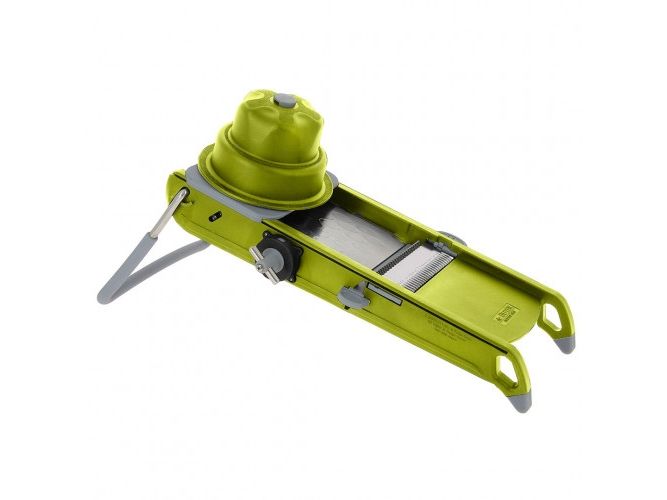 Mandoline made of stainless steel and polymer composite. The stainless steel ramp is smooth and with a textured surface to make the food slide easily. ?A new adjustable system allows to easily regulate the thickness of the cut from 0.5 to 10mm, with a space of 0.5mm.