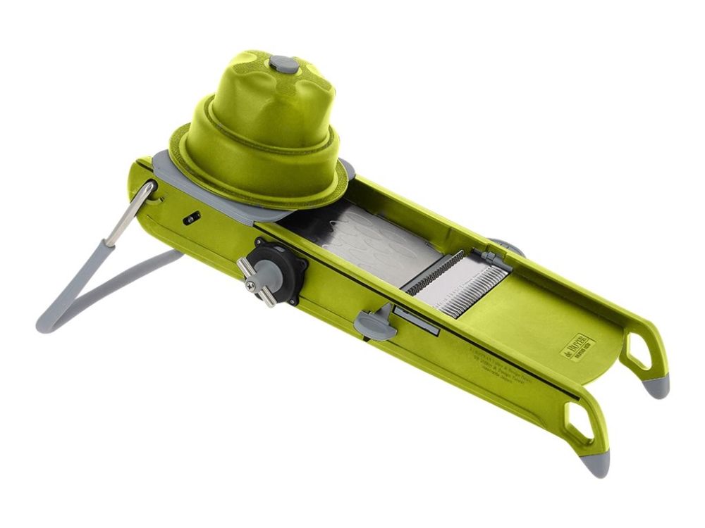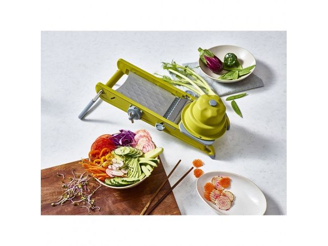For smooth or wavy round slices, julienne cuts of 4 or 10 mm, waffle cut. Double julienne blades, 4 and 10 mm. + Double horizontal blade, scalloped and fluted/serrated. Fluted/serrated side to cut all the fruits and vegetables, even the softest as tomatoes, oranges. Scalloped side for waffle cuts.