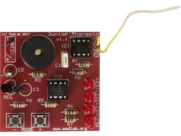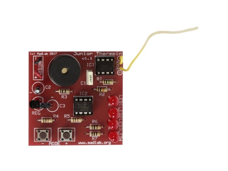 The Theremin was the first music synthesizer. The Junior Theremin is our, smaller, version of that classic electronic musical instrument. As you move your hand towards and away from the wire aerial, the Theremin responds by changing the pitch of the note it is playing. It can play individual notes as well as varying the tone of a single note.