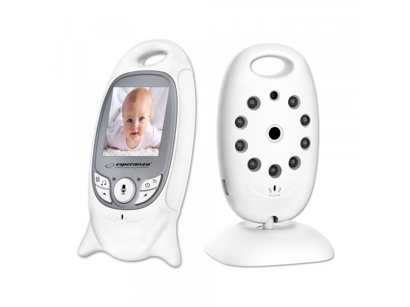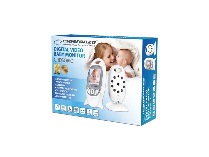 Baby monitor Esperanza GREGORIO helps you to provide your baby with excellent care, while allowing you to move freely around the house and perform other duties. The device has many useful functions, such as night monitoring, two-way intercom. Thanks to them, you will not only check what is happening to your child, but also soothe the child with your voice or play a lullaby remotely.Esperanza EHM001. Sensor type: CMOS, Video resolutions: 320 x 240 pixels, Night vision distance: 5 m. Maximum range: 260 m, Maximum indoor range: 50 m, Maximum outdoor range: 260 m. Product colour: White. Display diagonal: 5.08 cm (2"), Display resolution: 176 x 220 pixels, Display type: LCD. Power source type: Battery, DC, DC input voltage: 5 V, Receiver current: 0.2 A