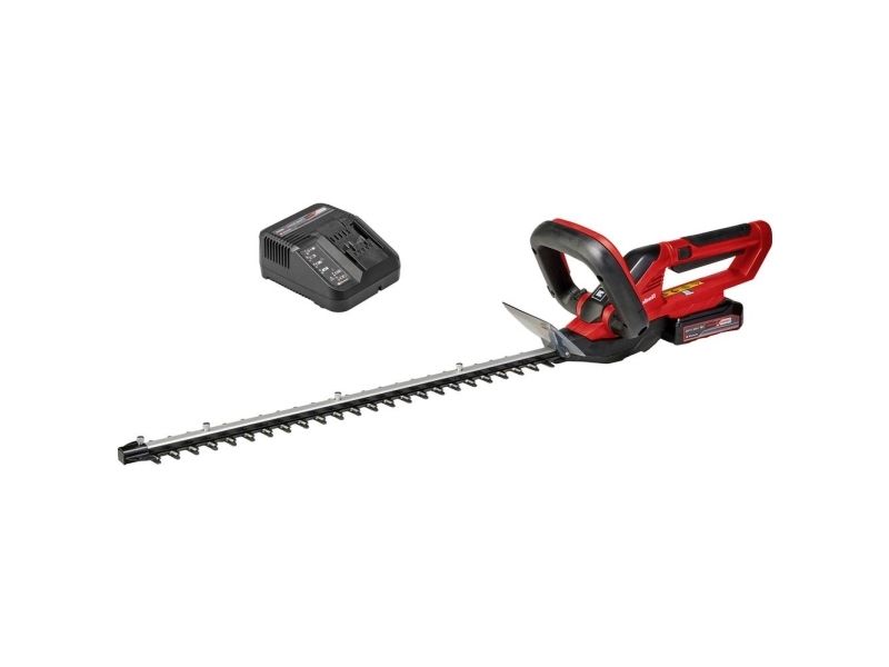 The GE-CH 1855/1 Li Kit cordless hedge trimmer is a very efficient tool which provides good service for the trimming of hedges, shrubs and bushes on large grounds where there is no connection to the electric power grid. With the new Power X-Change battery system from Einhell, the hedge trimmer has an 18 V battery pack with 2.5 Ah for long work sessions. For a long service life the gearing is made of metal, for clean cutting results the blades are made of laser-cut and diamond-ground steel. The GE-CH 1855/1 Li Kit has a battery charge level indicator with three LEDs where you can check the current charge level at a glance. In addition, the battery packs can be used for all products from the Power X-Change family. Complete with an additional high-speed charger. The integrated two-hand safety switch brings the cutters to a standstill in less than 1 second when a switch is released. The cutters are protected by an aluminium cover. The front handle is adjustable, while the rear handle can be swiveled for very good handling and optimum adjustment of the hedge trimmer to every working situation. The GE-CH 1855/1 Li Kit comes with a sturdy cutter guard for safe and user-friendly transportation or storage.Einhell GE-CH 1855/1 Li Kit (1x2,5 Ah). Blade size: 62 cm, Blade type: Single blade, Blade tooth spacing: 1.8 cm. Power source: Battery, Battery voltage: 18 V, Battery capacity: 2.5 Ah. Weight: 2.75 kg, Width: 195 mm, Maximum height: 99 cm. Package width: 130 mm, Package depth: 1005 mm, Package height: 175 mm