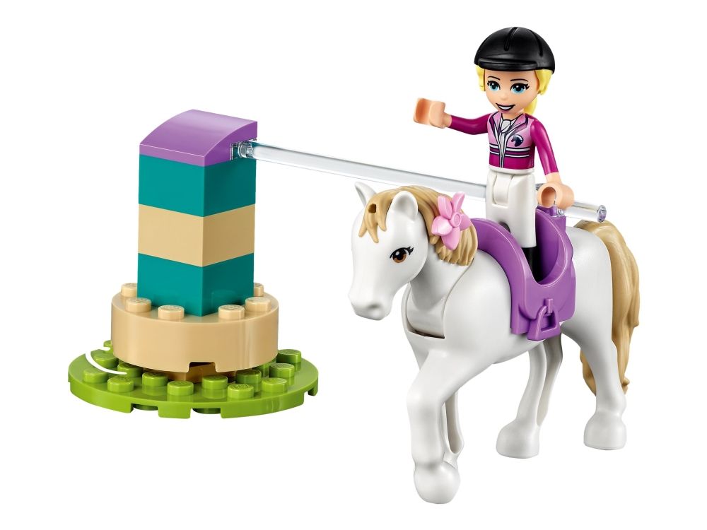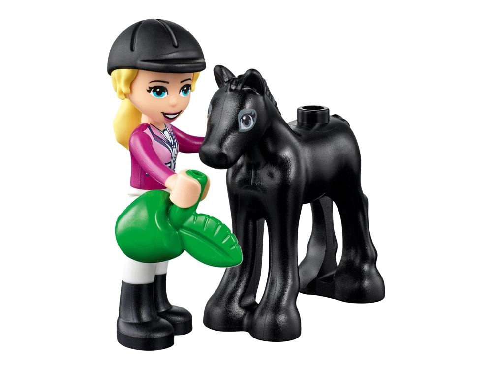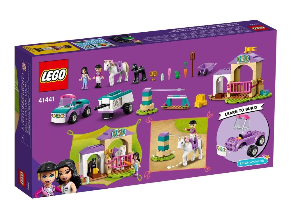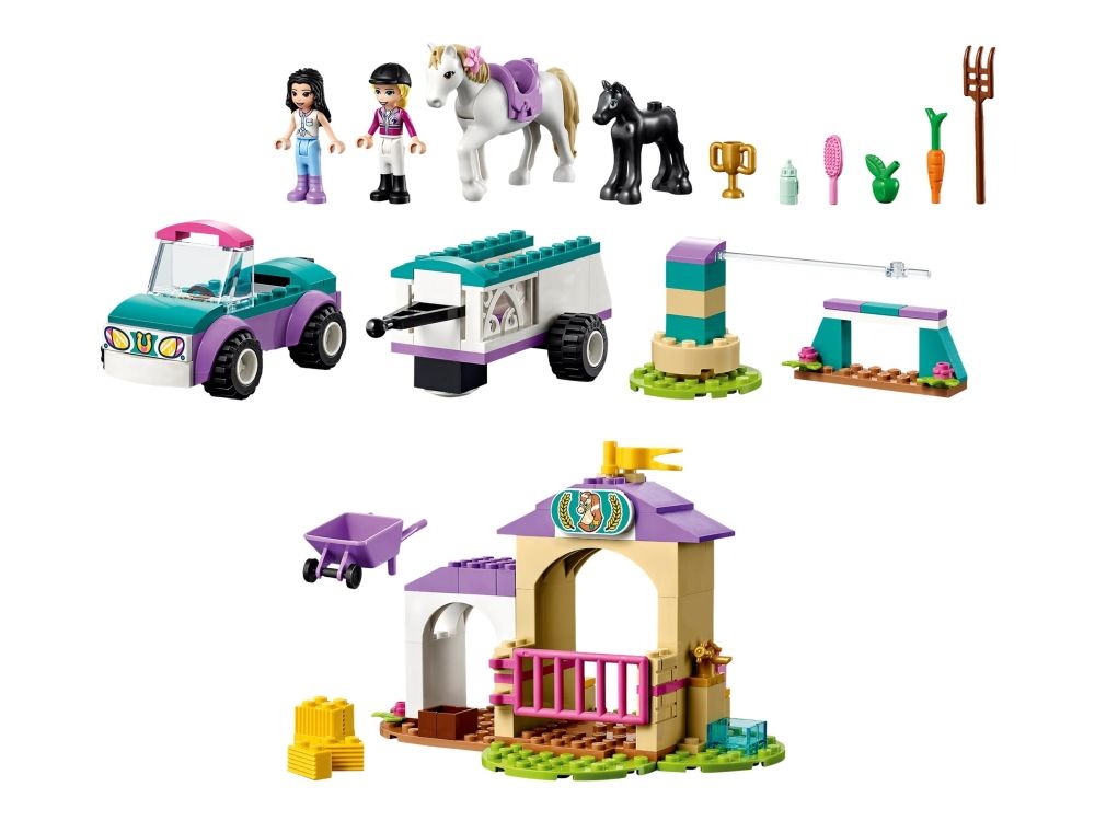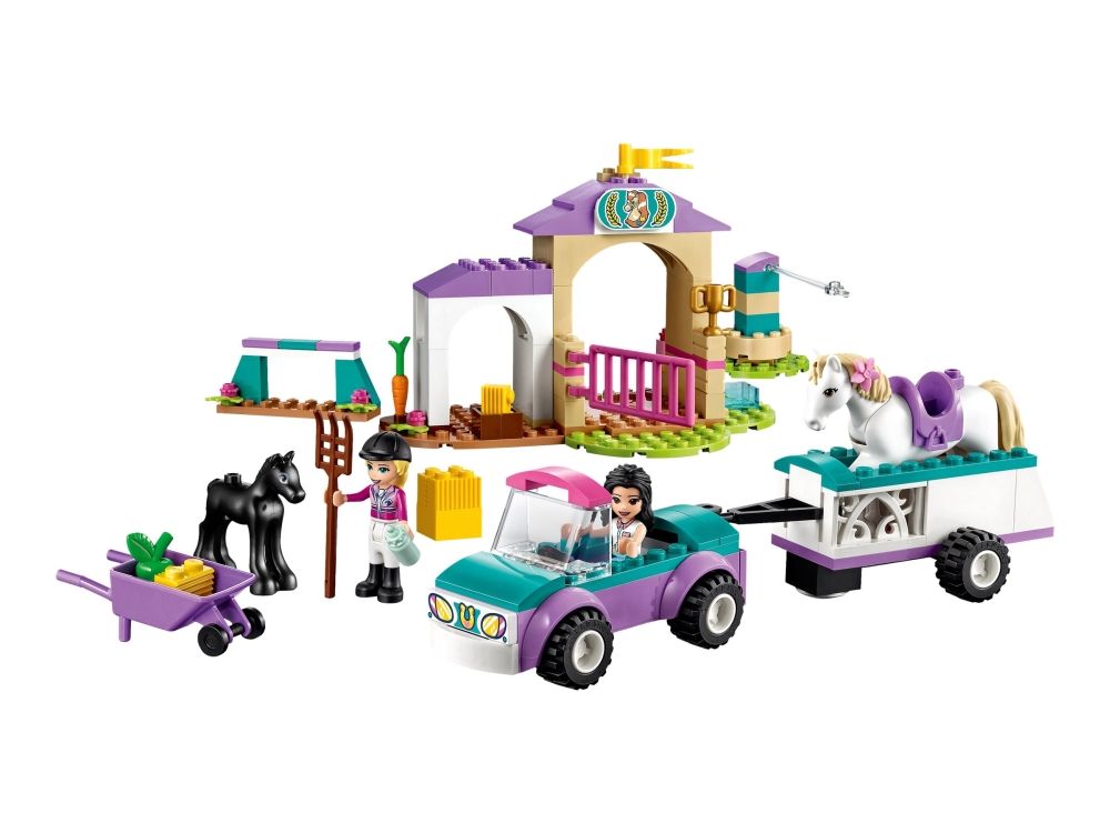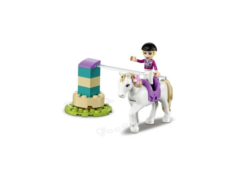 Playset includes a car for the LEGO® Friends to drive, a trailer for the horse, a stable with grooming kit, jumps and a training rein kids can use to teach the horse to walk around the ground.