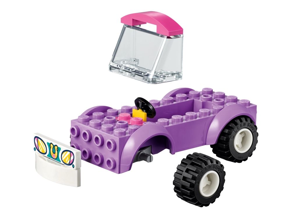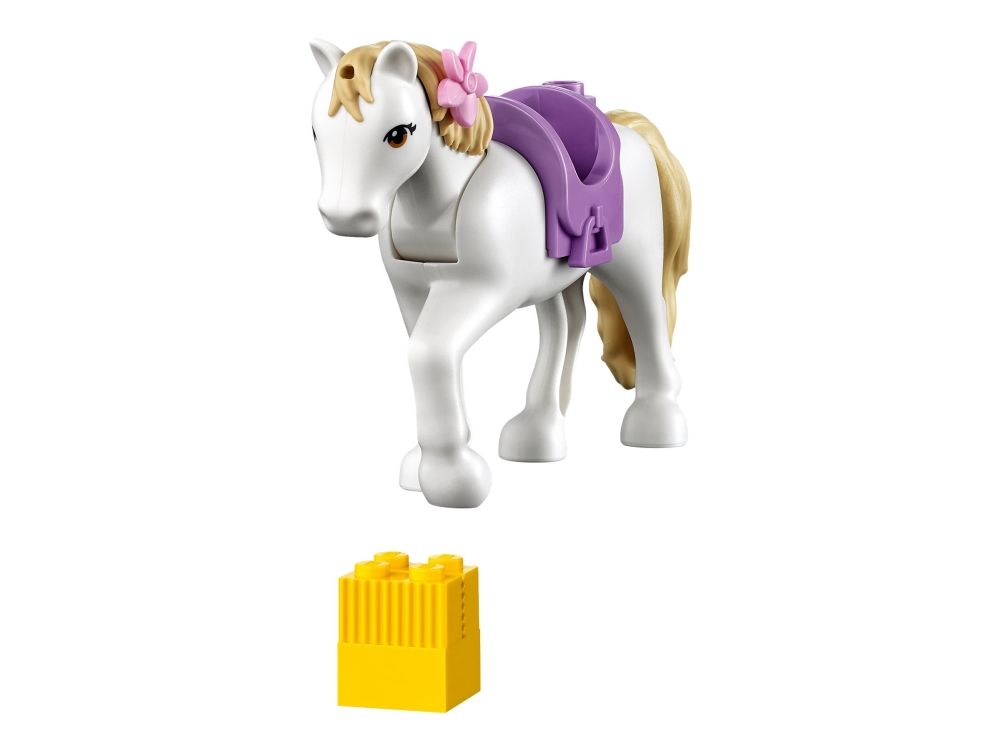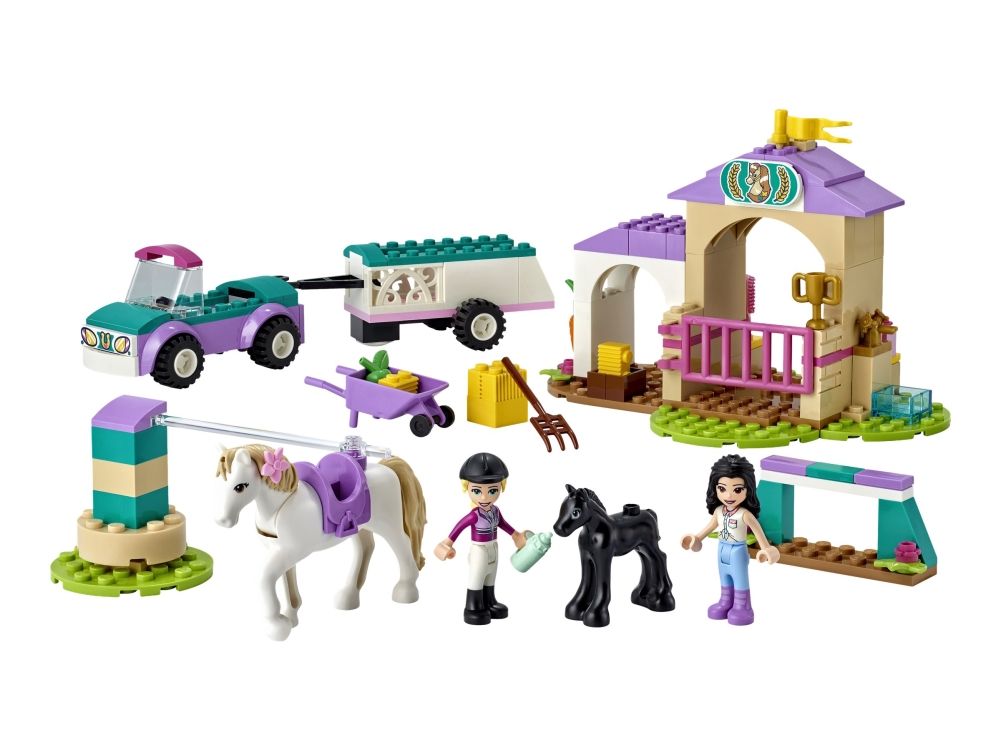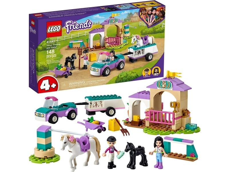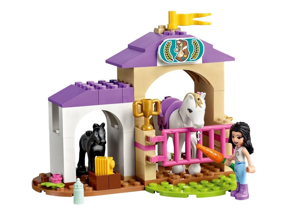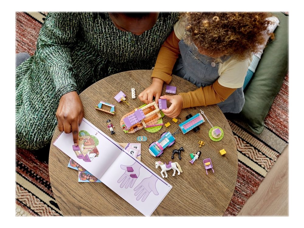 Playset includes a car for the LEGO® Friends to drive, a trailer for the horse, a stable with grooming kit, jumps and a training rein kids can use to teach the horse to walk around the ground.