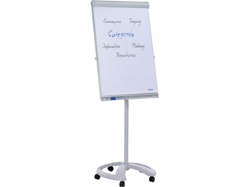 Flipchart-Tafel Deluxe Mobil. Tafel magnethaftend. Tafel beschreibbar. Typbezeichnung der Stativform: Standbein. Ausführung des Fußes: Glasfaserverstärkter Kunststoff-Rundfuß mit 5 Laufrollen. Abmessung der Standfläche: 57,5 x 62,5 cm. Gesamthöhe: 195 cm. Ausführung der Höhenverstellung: stufenlos von 180 bis 195 cm. 57,5 cm Armlänge. Schnellwechselhalterung für alle gängigen Flipchart-Blocks. Neigungswinkel: 15°. Werkstoff: Metall/Kunststoff. Ablageschale vorhanden. Anzahl der Arme: 2. Masse (Gewicht): 10kg. Größe (B x H): 67 x 95 cm. Garantie gewährt. Farbe des Gestells: hellgrau. Verpackung: Karton.