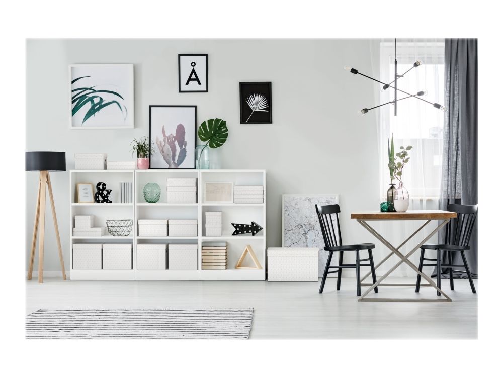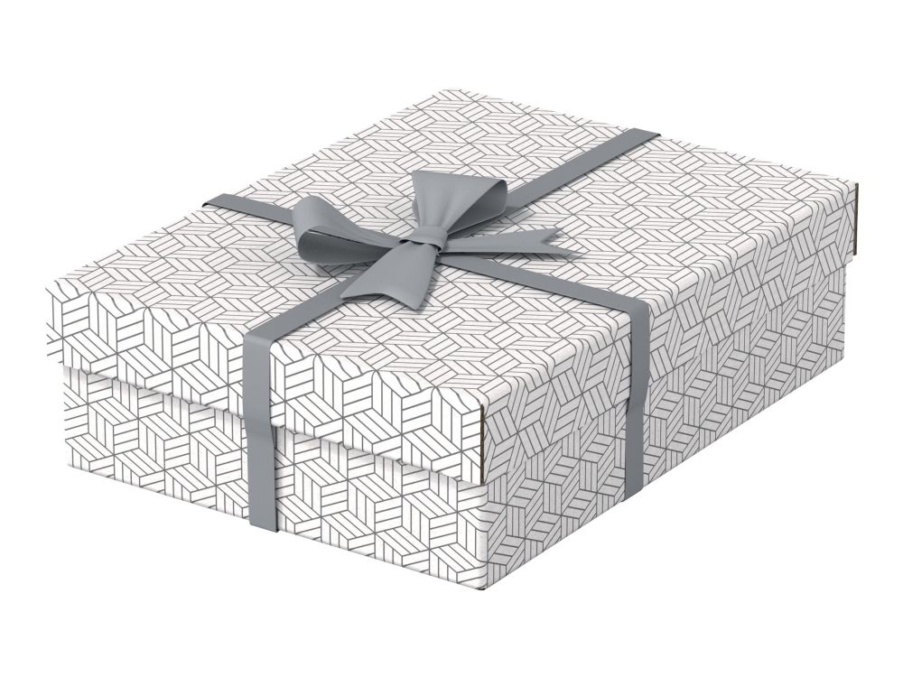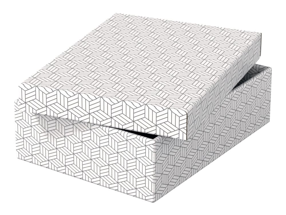 Set of three medium cardboard storage boxes with a modern and stylish geometric design Ideal for gifts or storing items such as personal documents, toys, books and other accessories Can be used alone or stored on shelves Use to package a gift and it can be reused by the recipient as home storage Removable lid to hide the contents and keep them covered Neutral colours and design will complement any décor and allow it to be easily accessorised for a gift Comes flat packed and is quick and easy to assemble Sides fold back on themselves during assembly to provide double the strength Wipe clean surface Made from strong and durable 100% recycled, 100% recyclable and FSC certified cardboard Packaging is 100% recycled, 100% recyclable and plastic free