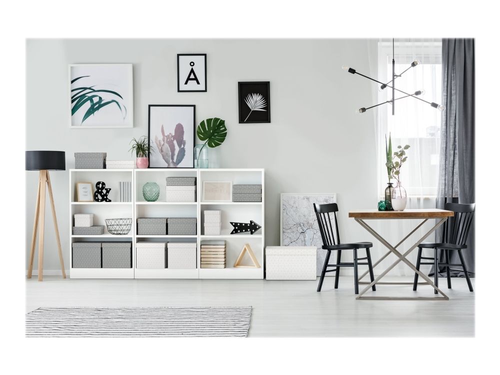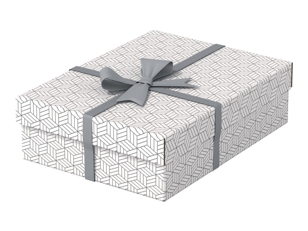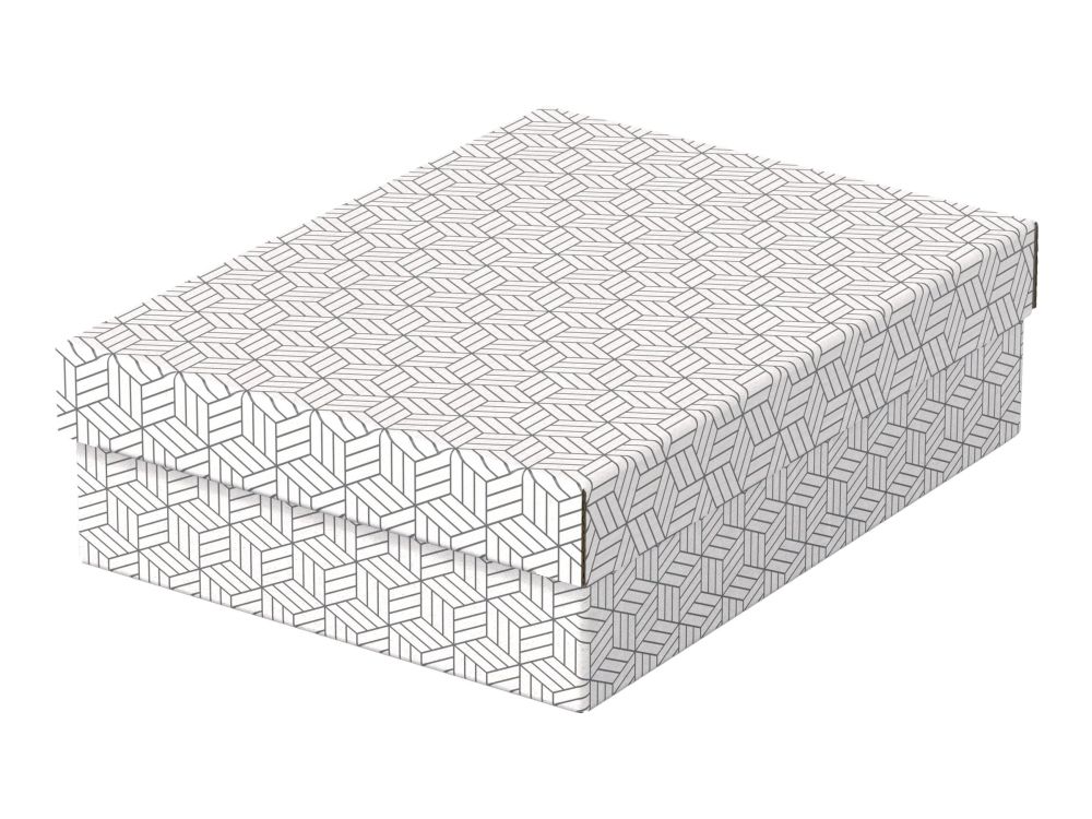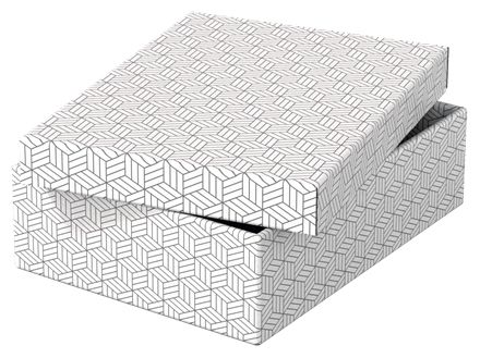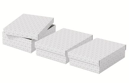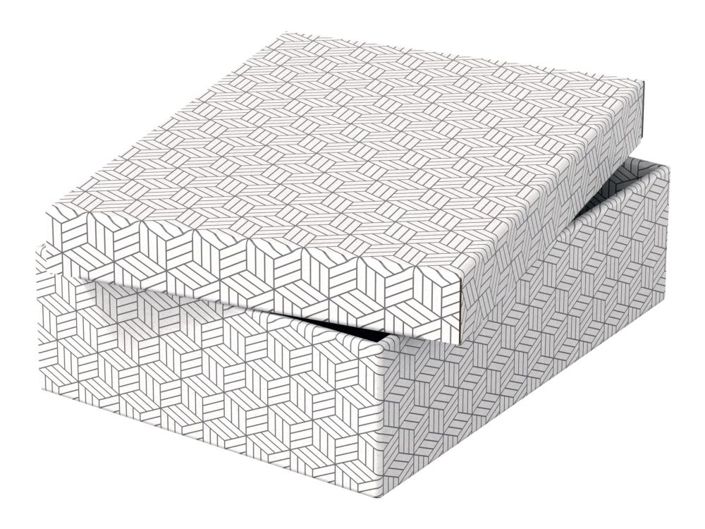 Stylish and modern cardboard storage boxes with removable lid ideal for packaging gifts or creating instant storage at home. Set of three boxes in the same size to use alone, store on shelves or in cube storage units to keep smaller items such as photographs and personal documents organised and easy to find. Add some ribbon and use to package a gift! Once opened, it can be reused by the recipient for home storage, providing 2 gifts in one. Made from strong, 100% recycled and 100% recyclable corrugated cardboard which is FSC certified. The wipe clean surface is finished with a dual colour, geometric design to add style to your storage. Comes supplied flat packed and is quick and easy to assemble. The sides fold back on themselves during assembly to provide double the strength, ensuring the boxes stay strong and protect the contents.