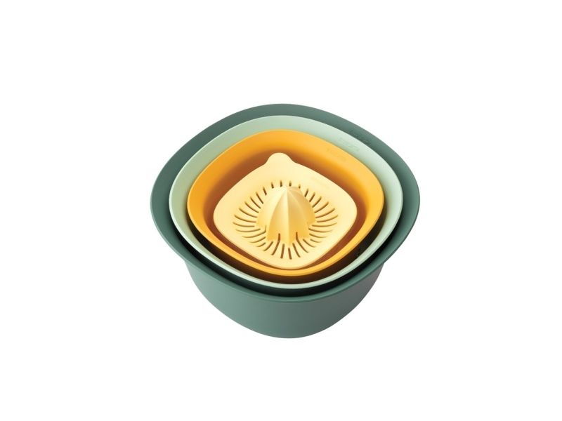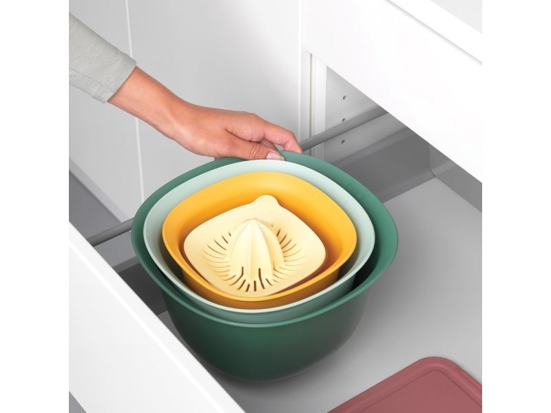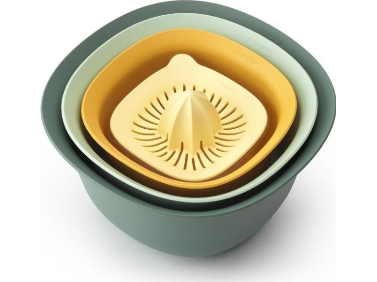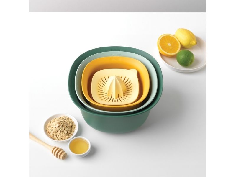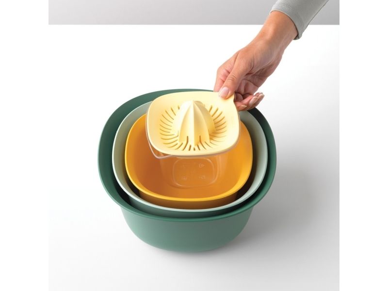 - Part of the Brabantia TASTY+ collection - a colourful tool for every kitchen job! - Space-efficient - nestable - easy to store in a kitchen cupboard. - Contents: mixing bowl 1.5 litre and 3.2 litre, colander and juicer plus measuring jug. - Mixing bowls with non skid base. - Measuring jug with easy to read marks in ml, pints, cups an fl.oz gradations - contents 500 ml. - Juicer suitable for all popular citrus fruits. - Easy to clean - dishwasher safe.