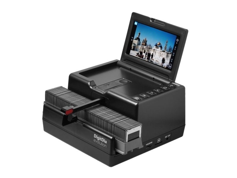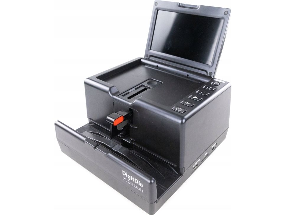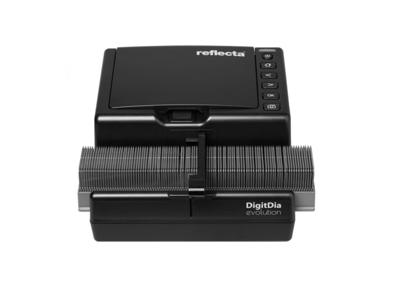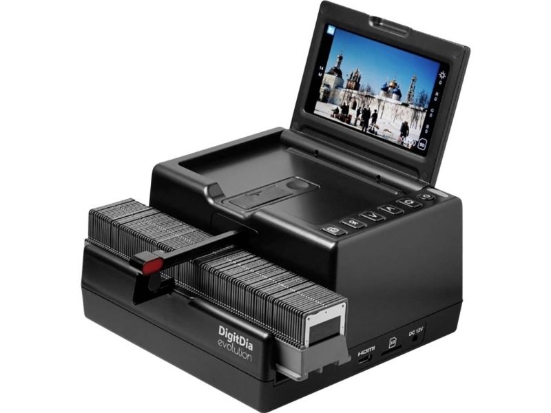 Slides suffer an unstoppable loss of quality over time. The colors fade or there is a color cast. Every year they lose their quality. Often the "best before" date has expired after 30 years. In many households there are still thousands of slides from old times waiting to be saved. With the new “DigitDia evolution” magazine scanner, even large quantities of slides can be preserved as digital exhibits for all time with little effort. With the innovative "DigitDia evolution", not only can the entire slide archive be digitized directly from the magazines, but the slides can also be viewed directly on the integrated 7 "IPS display (17.8 cm). The operation of the slide scanner, which does its work completely independently of a computer, is child's play. An innovative CMOS image sensor guarantees high scan quality and speed. The diffuse daylight LED light source ensures optimal color rendering and at the same time reduces dust and scratches. Corrections to color and exposure can be carried out either automatically or manually. An external monitor, a television set or a projector can optionally be connected via the HDMI output of the "DigitDia evolution". This means that a classic slide shows are also possible again. Both playback and digitization of the slides can be done manually or automatically. The automatic scanning of a complete magazine with 50 slides takes only four minutes in the best resolution (up to 4608 x 3072 pixels or 5750 x 3840 pixels interpolated), whereby the digital images are saved directly on an SD card (up to 128 GB) . This means that the scanning speed for a single slide is less than five seconds, and 35mm slides with all common frames can be used in Universal, CS or LKM magazines.