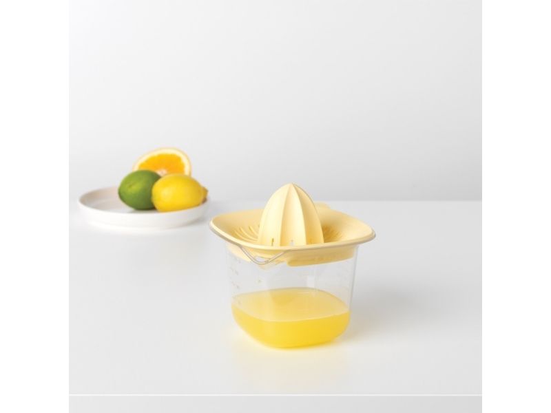 - Part of the Brabantia TASTY+ collection - a colourful tool for every kitchen job! - Juicer suitable for all popular citrus fruits. - Easy to read marks in ml, pints, cups and fl.oz gradations - contents 500 ml. - Easy and light operation - square shape for secure grip during pressing. - Space-efficient - nestable - easy to store. - Easy to clean - dishwasher safe.