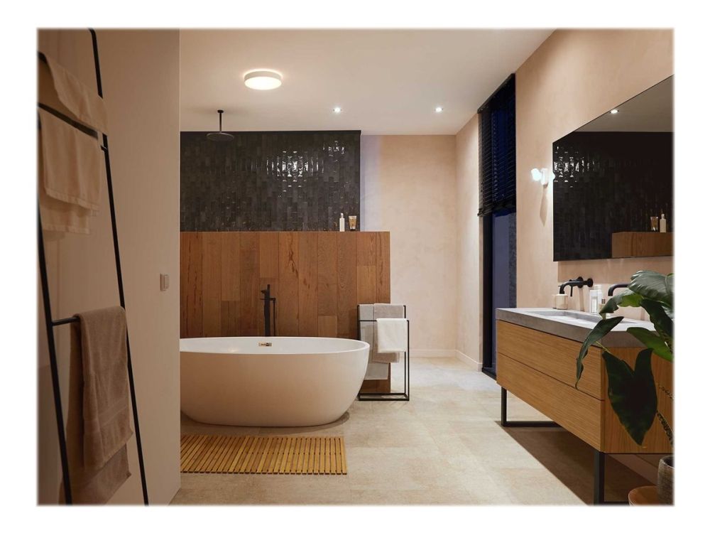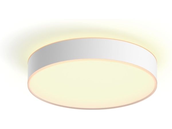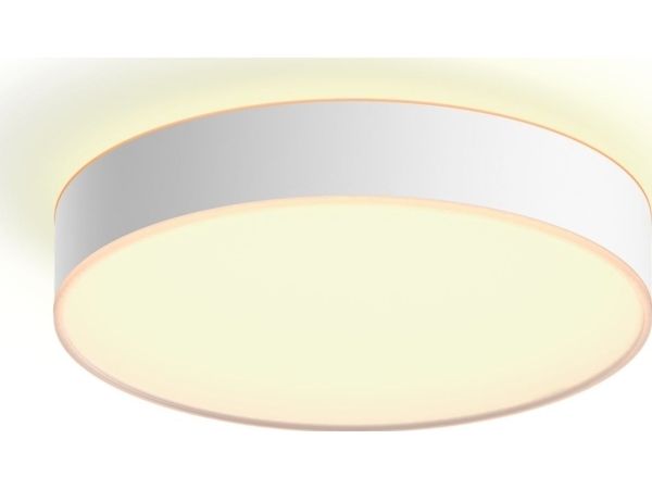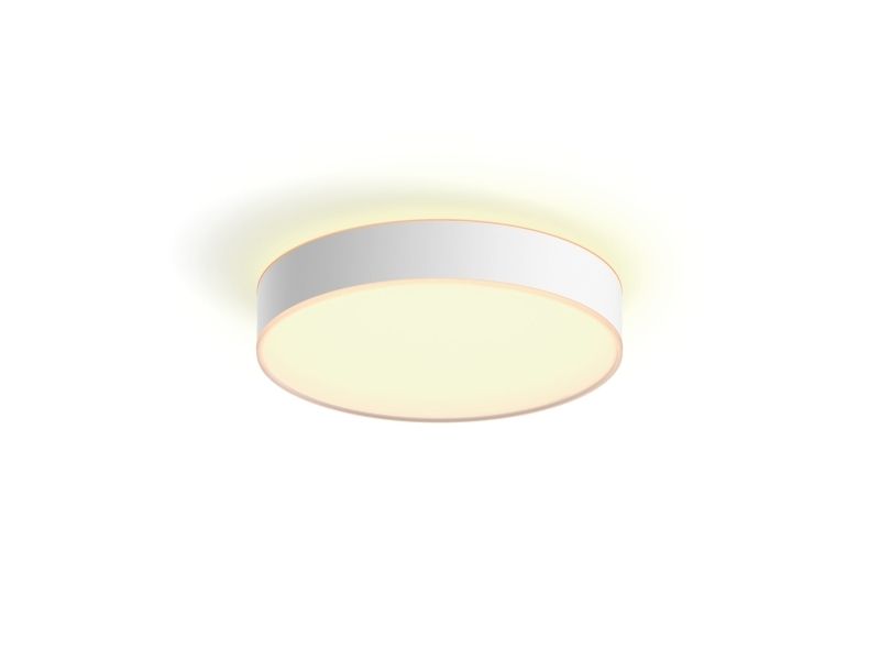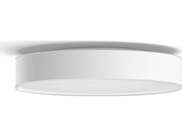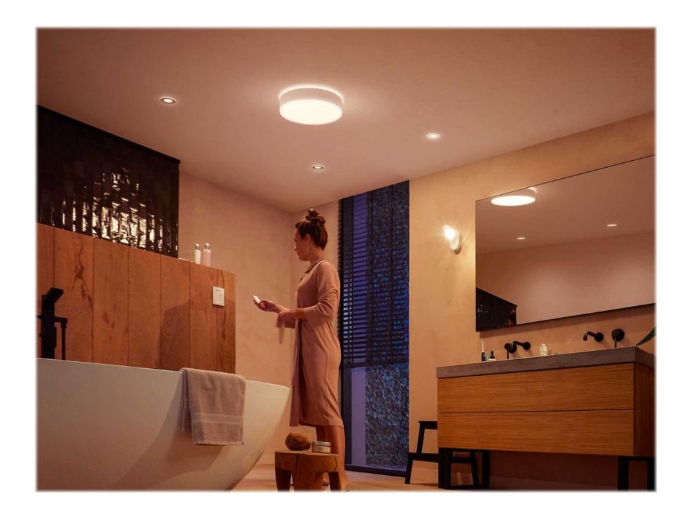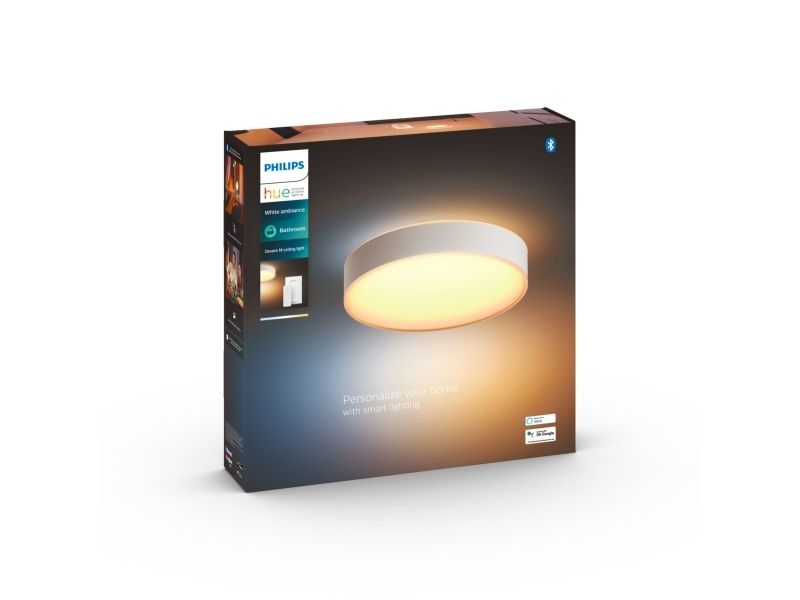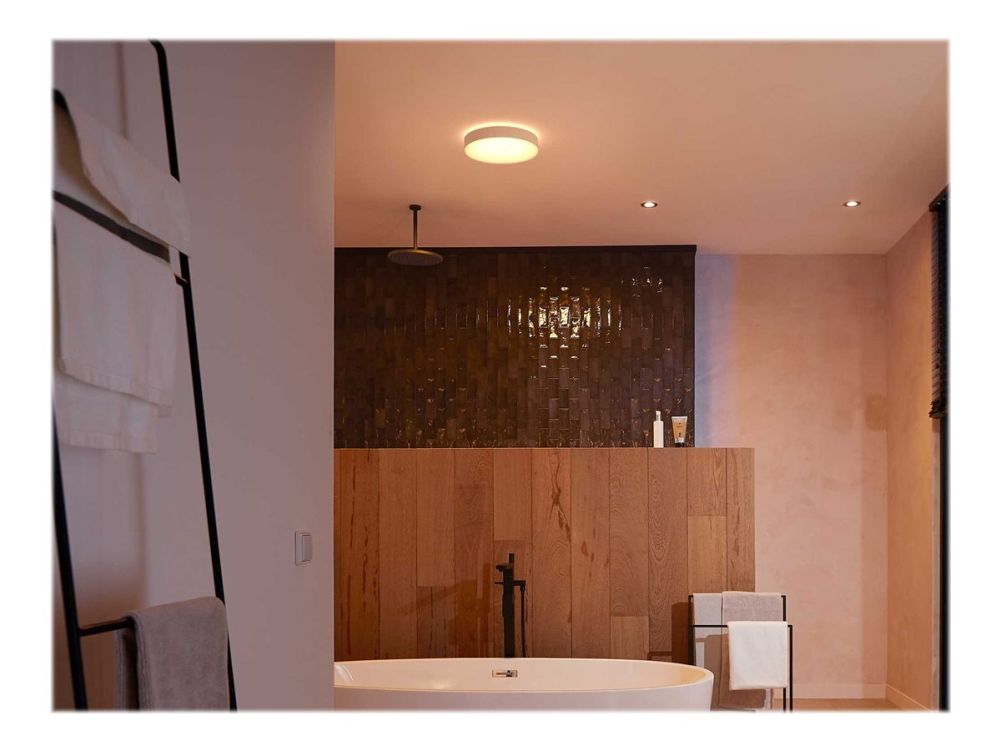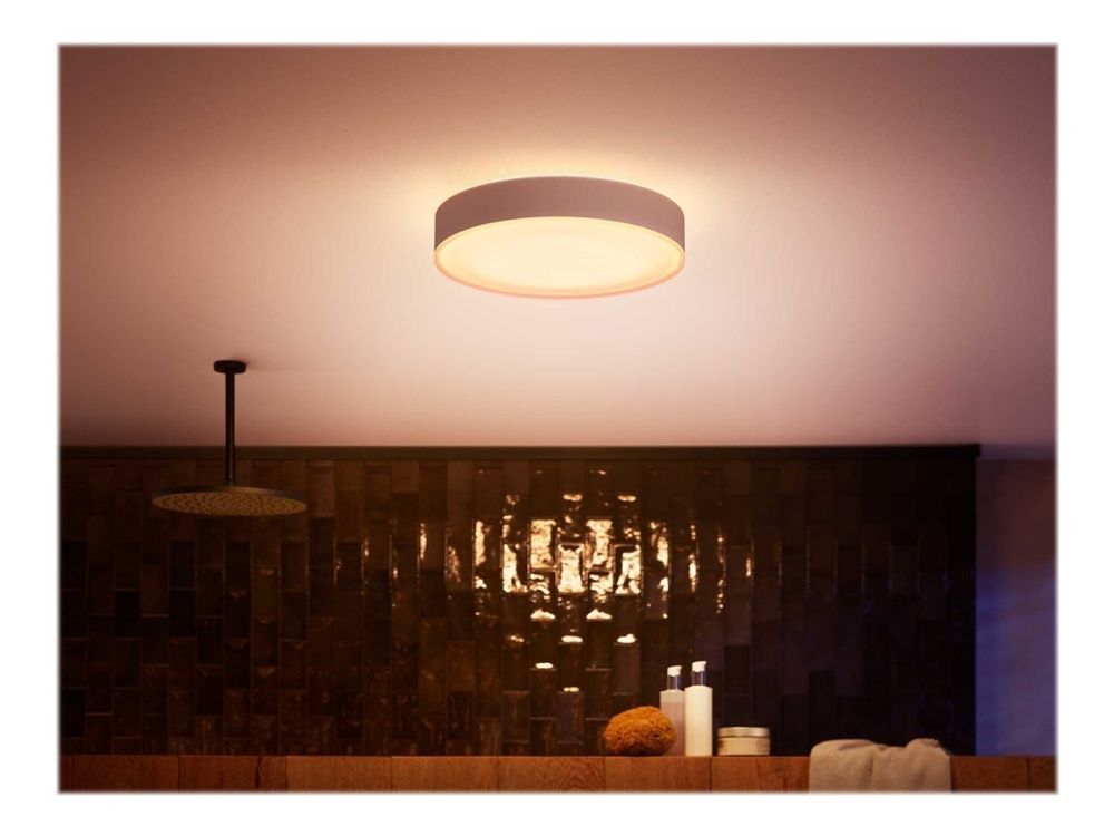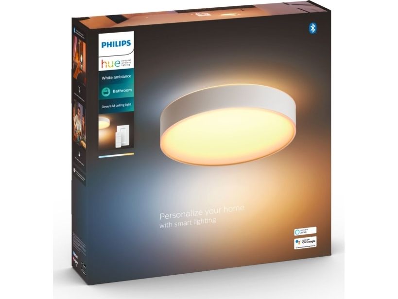 Easy smart lighting Get powerful, warm-to-cool white light in the bathroom with the medium Devere ceiling light in white. Brighten the room to apply make-up or get ready for work in the morning – or dim down low for a relaxing soak in the bath.Philips Hue White ambience Devere medium ceiling lamp. Type: Smart ceiling light, Interface: Bluetooth, Product colour: White. Energy efficiency class: F, Input voltage: 50–60 Hz, Bulb voltage: LED. Width: 381 mm, Depth: 381 mm, Height: 84 mm. Package width: 437 mm, Package depth: 457 mm, Package height: 100 mm. Quantity per pack: 1 pc(s)