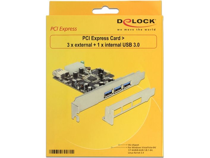 The Delock PCI Express card expands your PC by three external USB 3.0 ports as well as one internal USB 3.0 port. You can connect USB 3.0 devices like e.g. docking station, card reader, external enclosure etc. to the card. Since the USB-A interface is compatible to its forerunners USB 2.0 and USB 1.1, you can still use your existing USB devices.