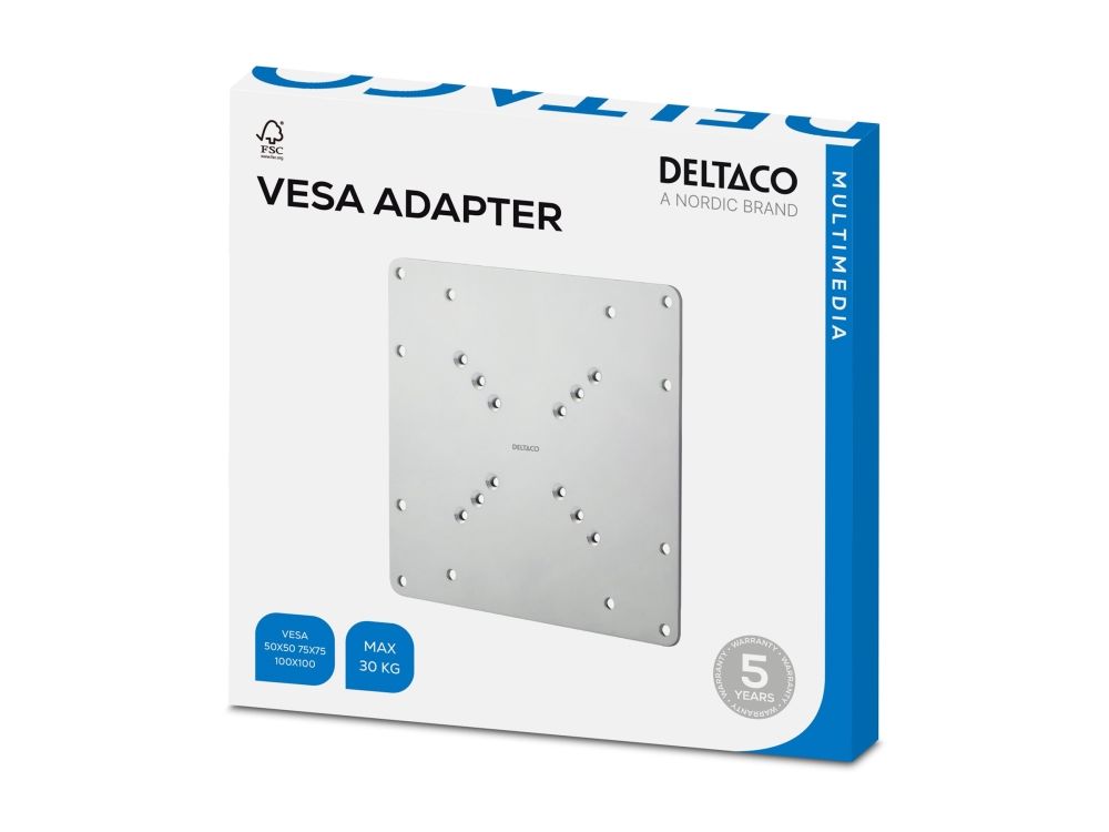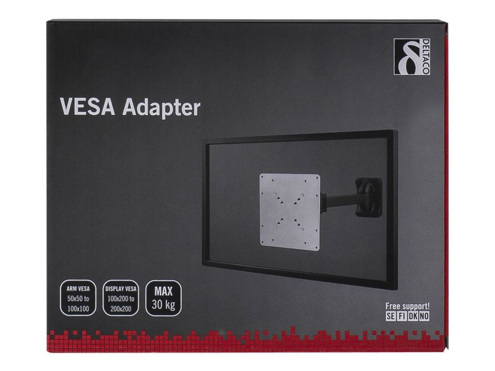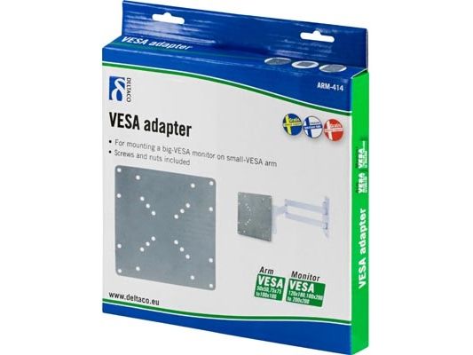 With this product you can convert a VESA 75x75mm or 100x100mm mount to a 120x180 / 200x100 / 200x200mm mount. Suitable for converting older monitor arms to fit newer / larger monitors.Deltaco ARM-414. Maximum weight capacity: 30 kg, Minimum VESA mount: 75 x 75 mm, Maximum VESA mount: 200 x 200 mm. Product colour: Silver