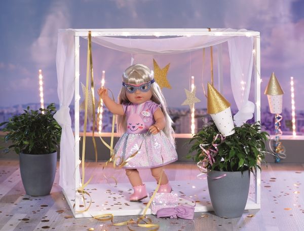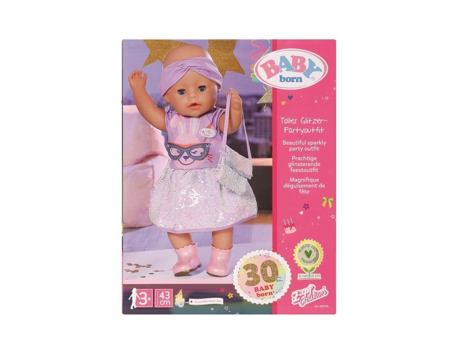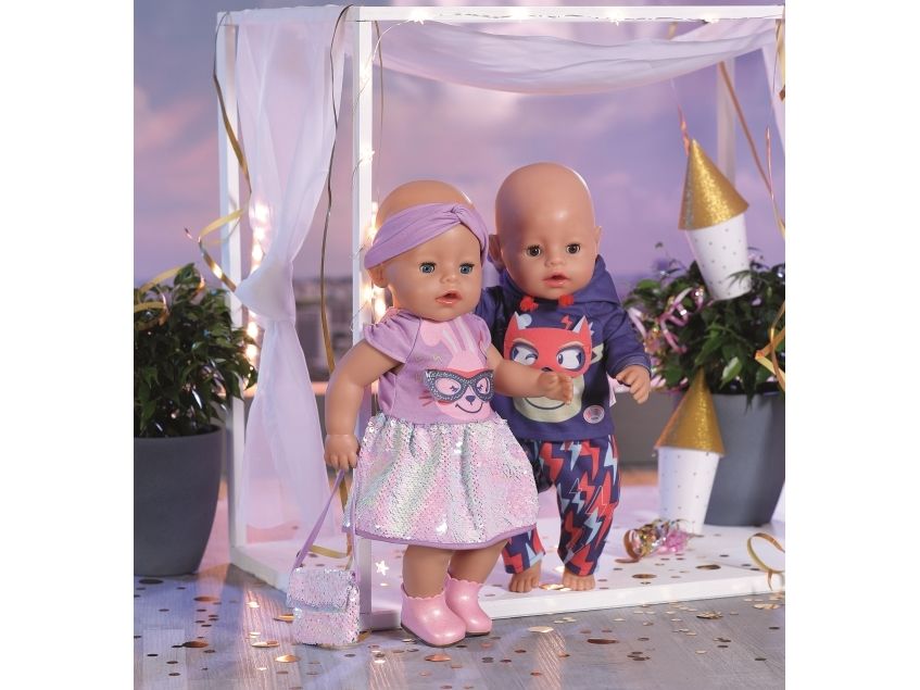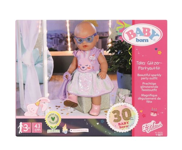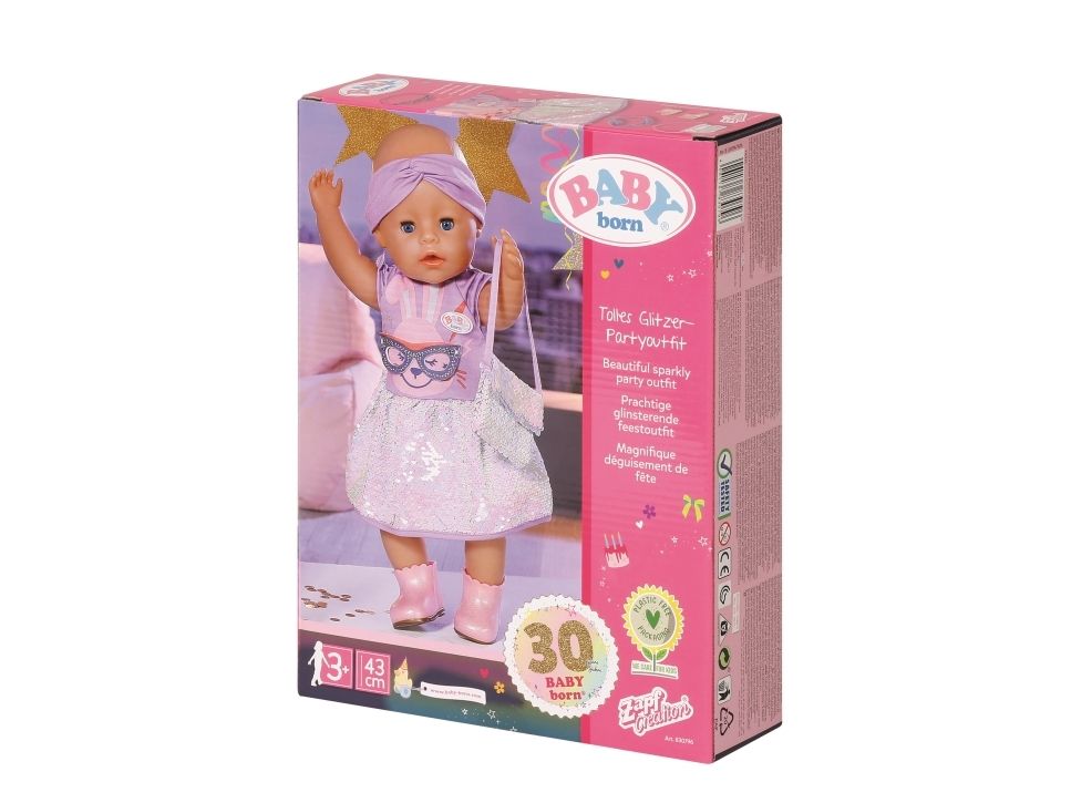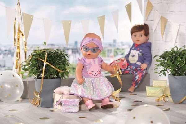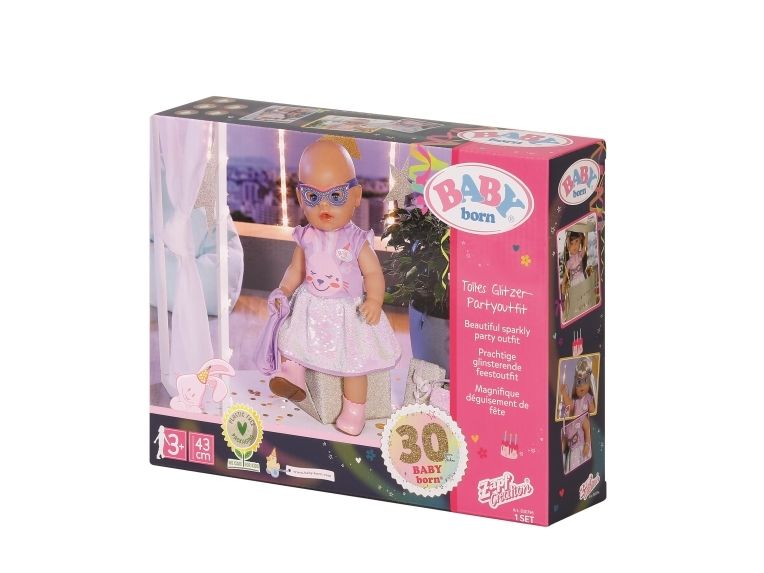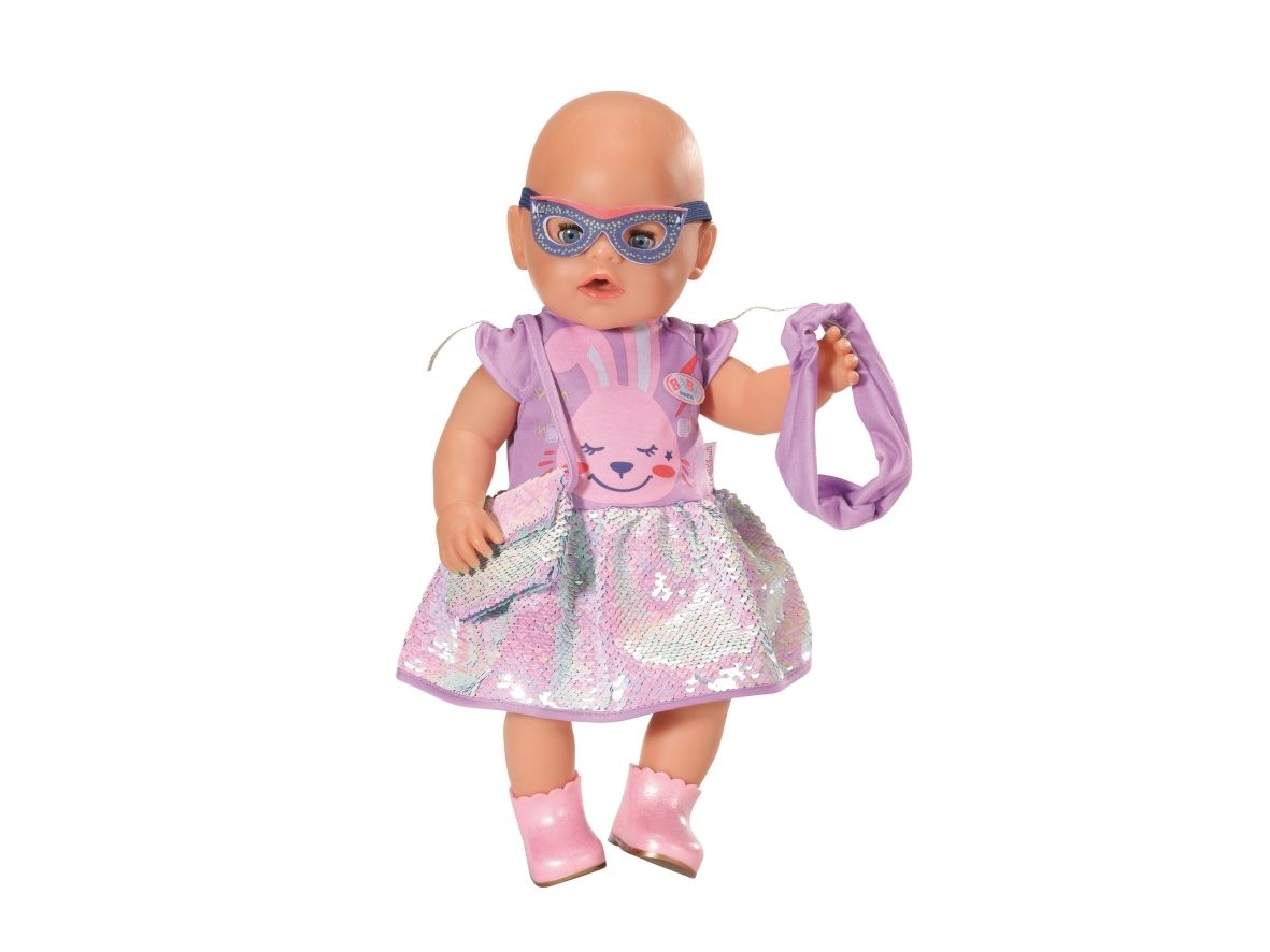 Dress with sequins, headband, pair of shoes and bag with sequins. Where did I put my glasses?” When you're “30 years” old, that’s a valid question. BABY born, the little party princess, is celebrating her 30-year doll anniversary. The blue mask can be worn as glasses on the headband or be a styling element on the dress for Benno the Bunny. After all, the bunny likes to party too. The dress has a skirt made from colour-changing sequins. BABY born’s handbag is also decorated with the glittering sequins. Pink booties complete the birthday outfit. High-quality clothing which is very easy to put on and take off. For enhanced, diverse and long-lasting fun through play. From 3 years. Includes: - BABY born Deluxe Happy Birthday outfit 43 cm with dress, headband and shoes, style mask and handbag
