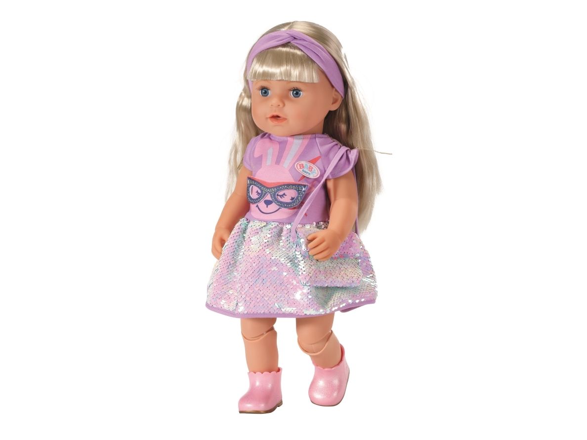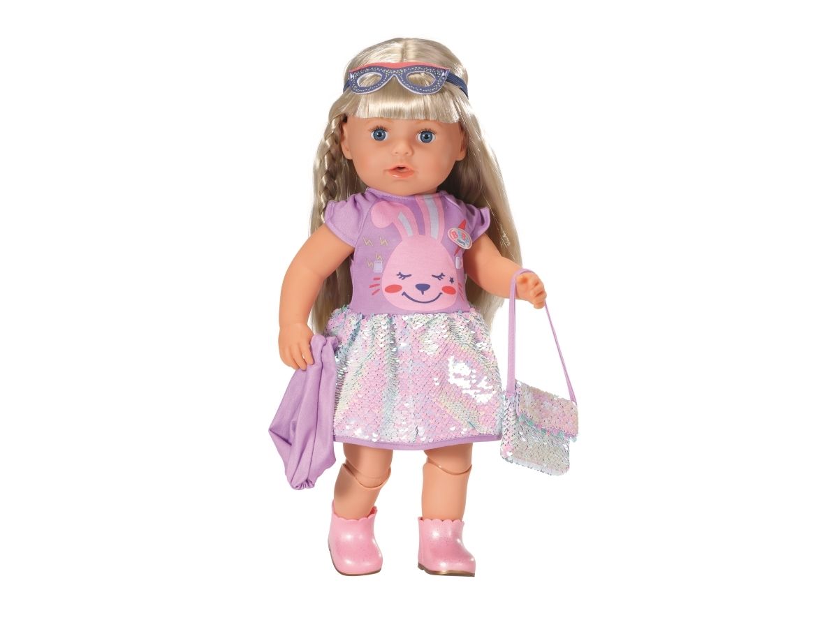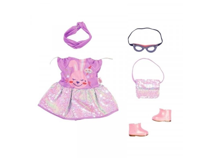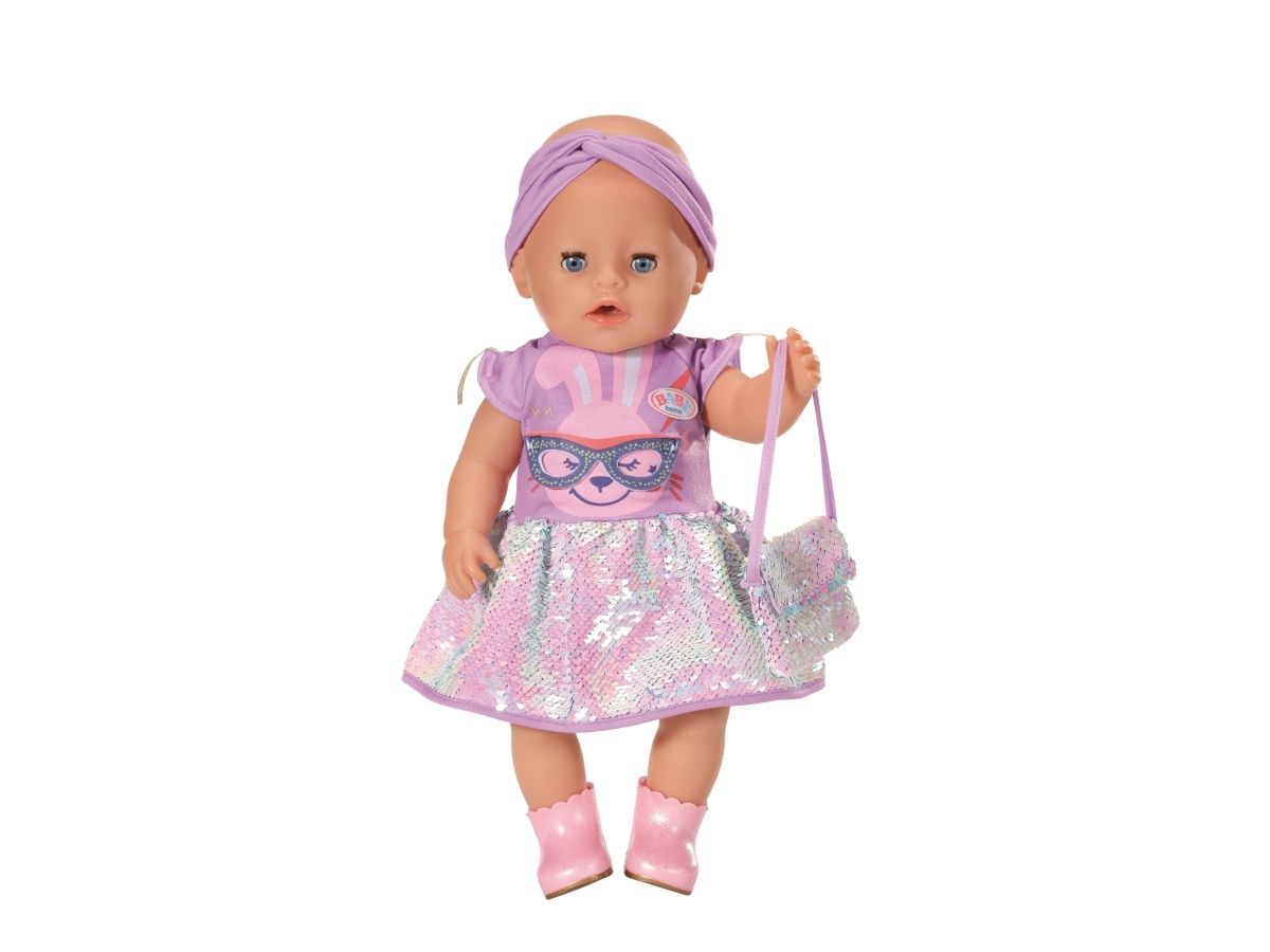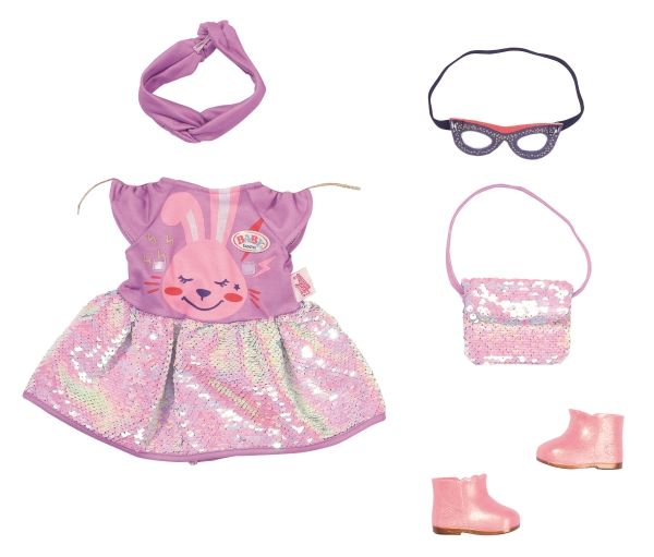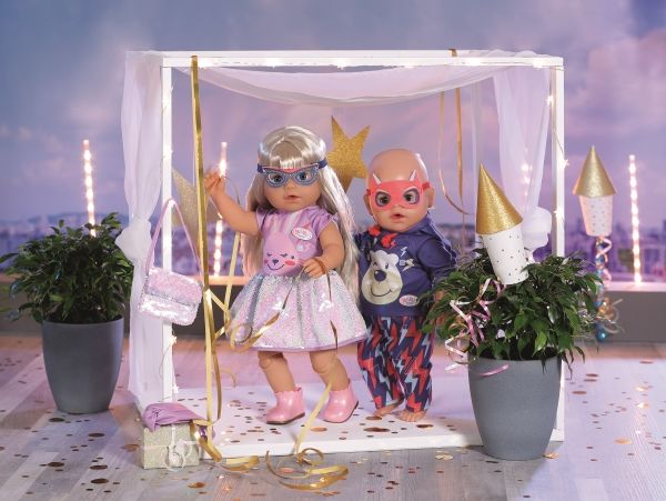 Dress with sequins, headband, pair of shoes and bag with sequins. Where did I put my glasses?” When you're “30 years” old, that’s a valid question. BABY born, the little party princess, is celebrating her 30-year doll anniversary. The blue mask can be worn as glasses on the headband or be a styling element on the dress for Benno the Bunny. After all, the bunny likes to party too. The dress has a skirt made from colour-changing sequins. BABY born’s handbag is also decorated with the glittering sequins. Pink booties complete the birthday outfit. High-quality clothing which is very easy to put on and take off. For enhanced, diverse and long-lasting fun through play. From 3 years. Includes: - BABY born Deluxe Happy Birthday outfit 43 cm with dress, headband and shoes, style mask and handbag