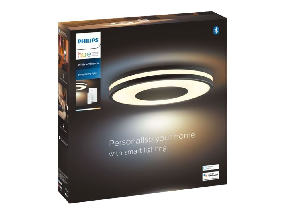 Easy smart lighting Enjoy a subtle glow with the Philips Hue White Ambiance Being ceiling light in black. Thin circles of aluminium cast warm-to-cool white light in three directions. Control instantly with the included Hue dimmer switch or Bluetooth. Unlock more smart lighting features with a Hue Bridge.Philips Hue White ambience Being ceiling light. Type: Smart ceiling light, Interface: Bluetooth, Product colour: Black. Energy efficiency class: F, Input voltage: 50–60 Hz, Bulb voltage: 24 V. Width: 348 mm, Depth: 348 mm, Height: 51 mm. Package type: Box, Package width: 3960 mm, Package depth: 3960 mm. Quantity per pack: 1 pc(s)