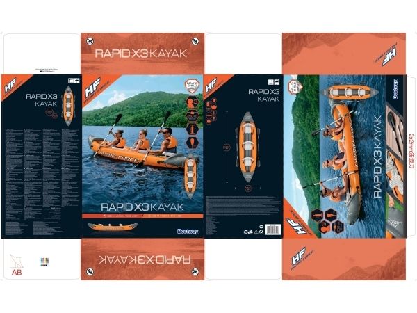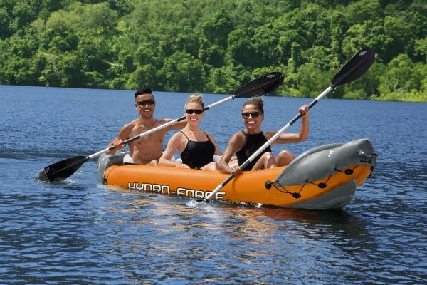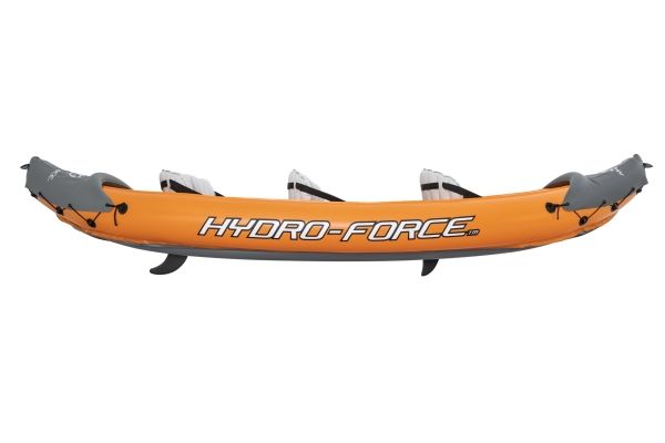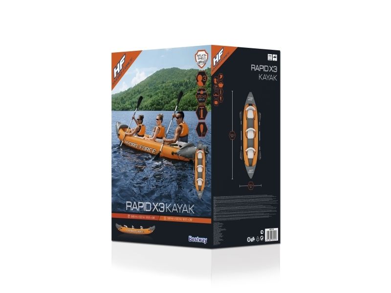 The Hydro-Force Rapid X3 Inflatable Kayak Set is a must-have for every outdoor enthusiast. Not only will this roomy kayak hold up to three adults, but it also inflates and deflates quickly and packs down to a small size, making it easy to bring along on any adventure. Made from Inflata-Shield Pro material, this kayak offers excellent puncture resistance and rigidity, limits stretching and maximizes stability. The Rapid X3 is great for use on creeks, small rivers, lakes and more. The comfortable cockpit features three inflatable seats with cushioned backrests to keep you comfortable on long rides, while the form-fitted construction prevents water from getting into the kayak and soaking you or your gear. A grab rope with built-in grommets allows you to easily transport or dock the kayak. Or use the sturdy carrying handles to transport the boat while inflated. The set also includes a pair of aluminum paddles and a convenient hand pump for easy inflation. Bring out your inner explorer with the Hydro-Force Rapid X3 Inflatable Kayak.