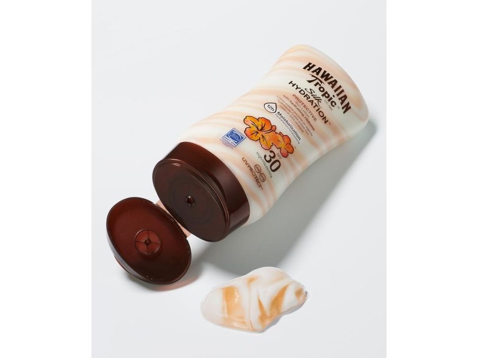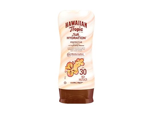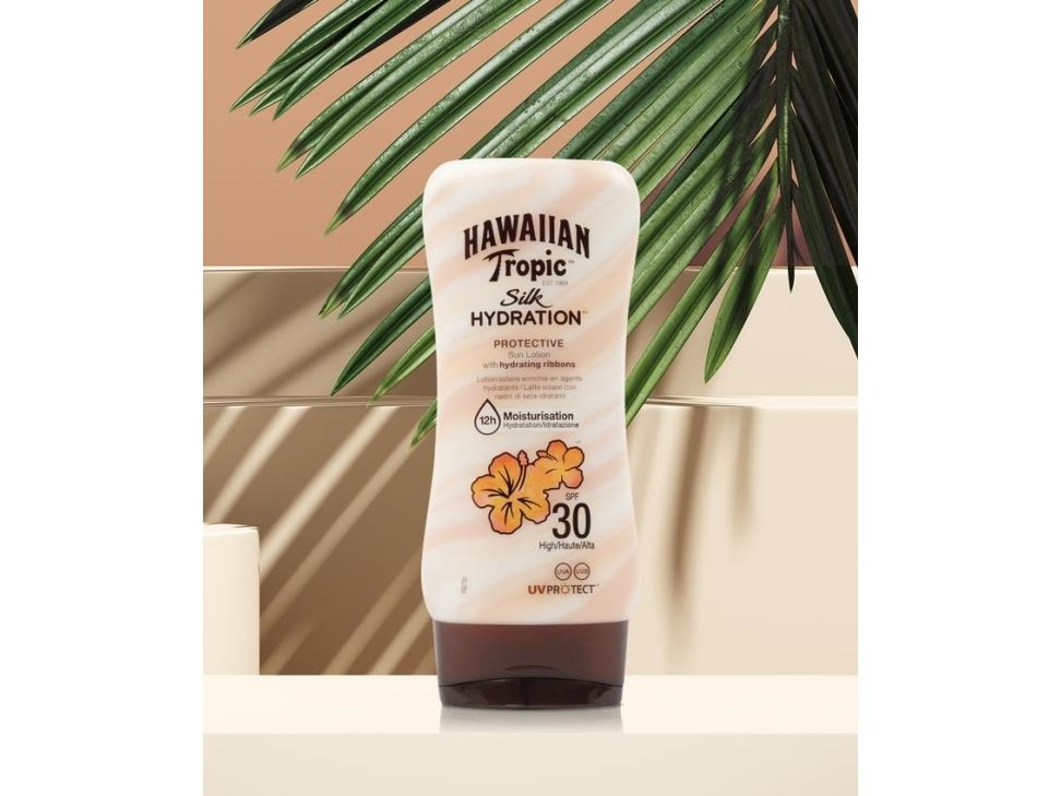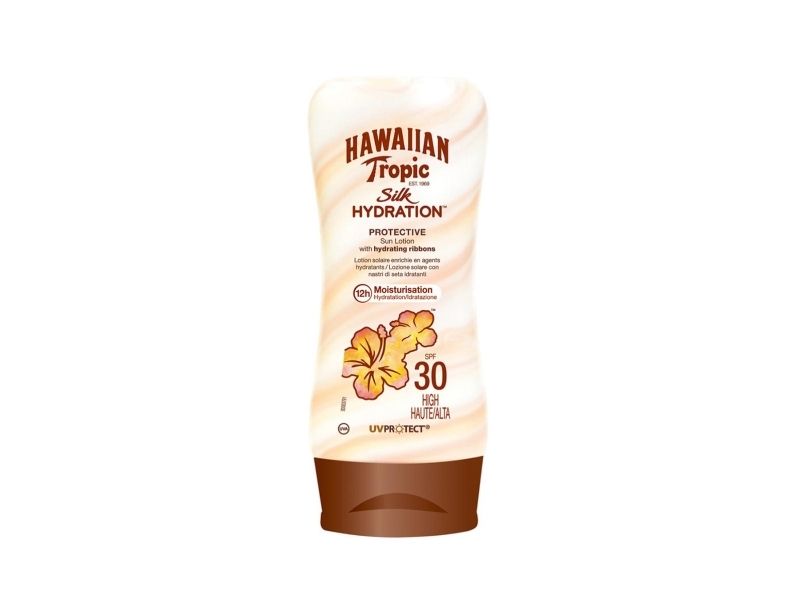 Keep that blissful feeling from sun up to sun down with Hawaiian Tropic® Silk Hydration Lotion sunscreen. Hydrating ribbons and exotic island botanicals offer 12-hour hydration that pampers skin while providing broad-spectrum UVA and UVB protection.