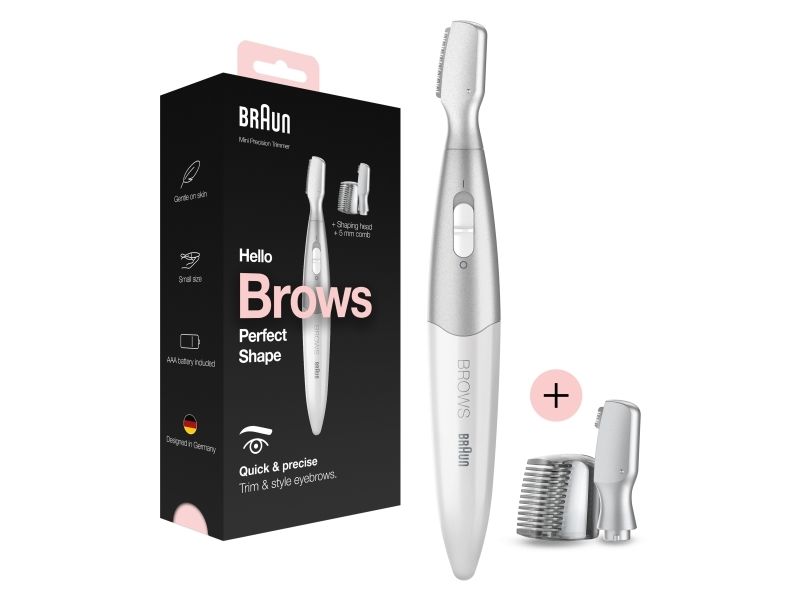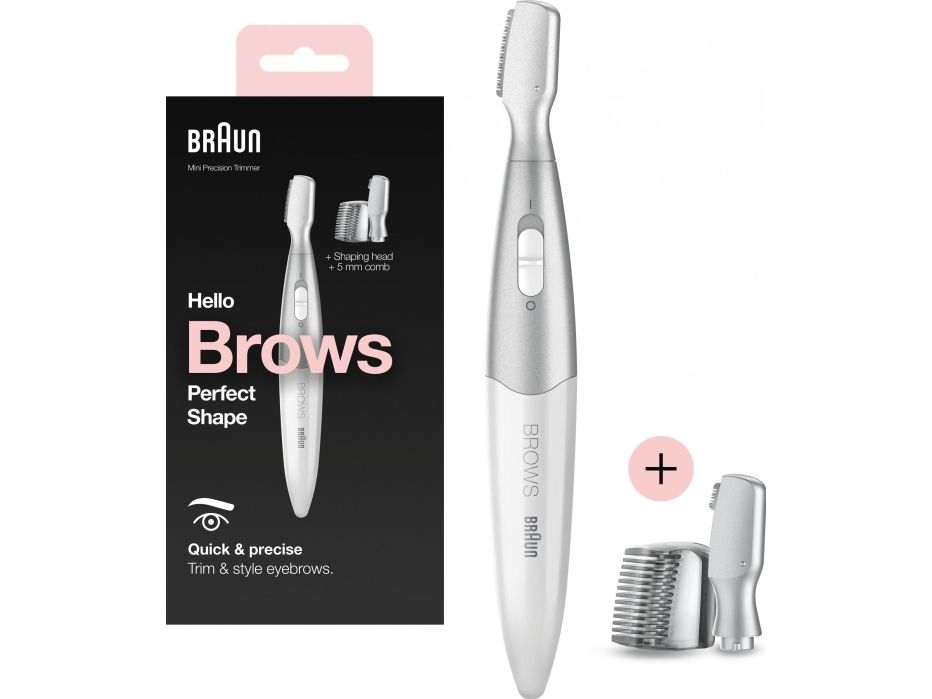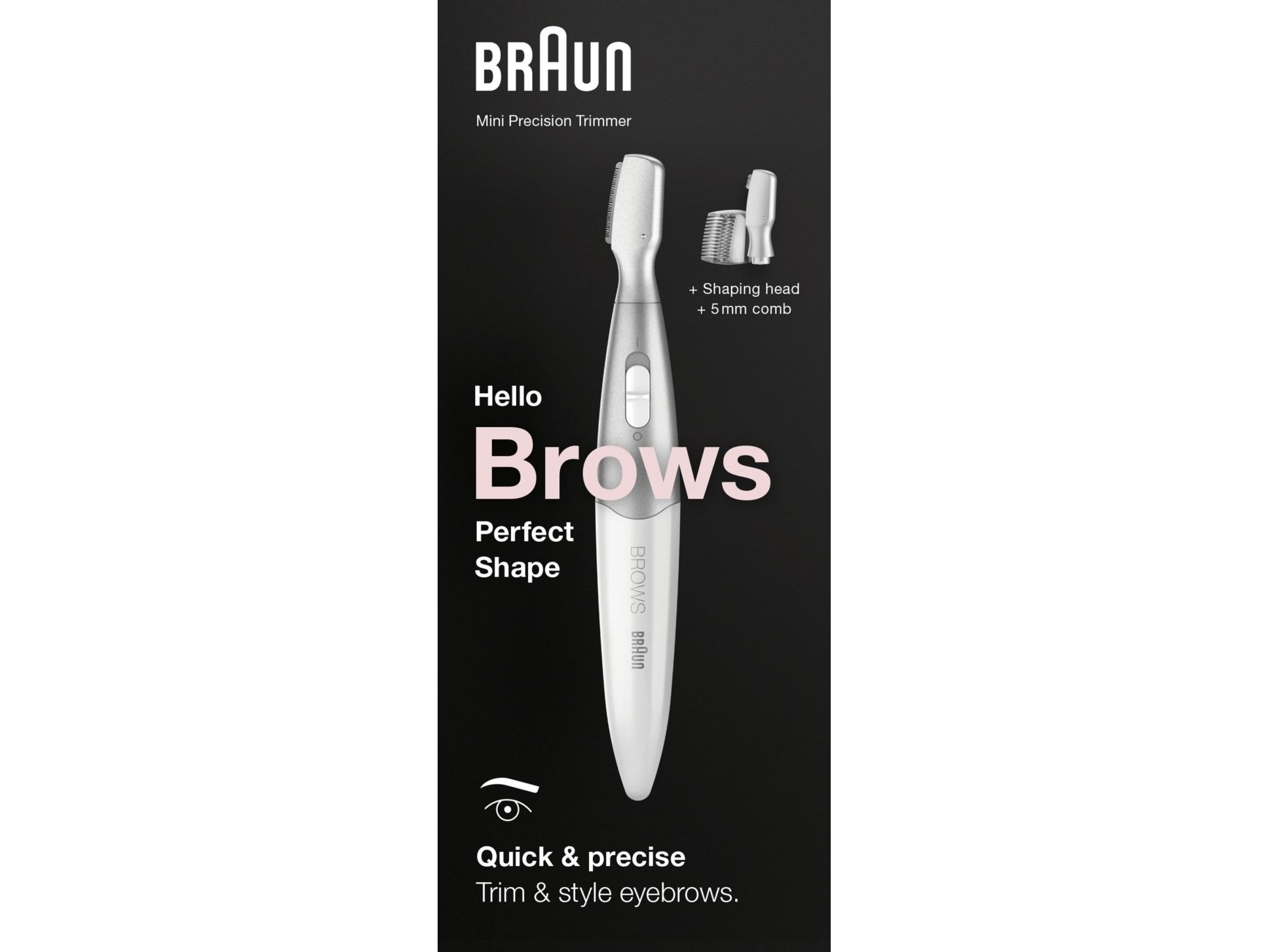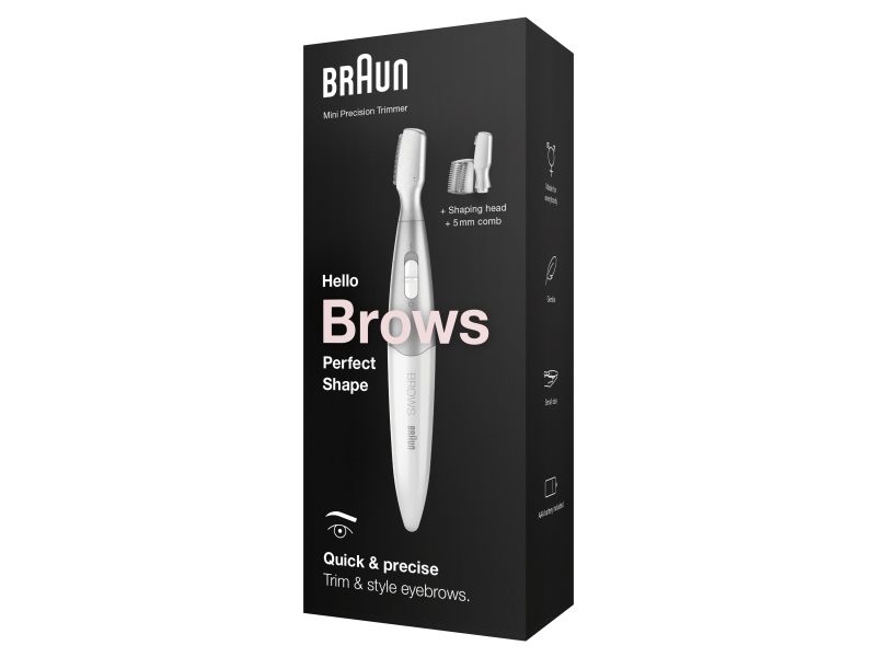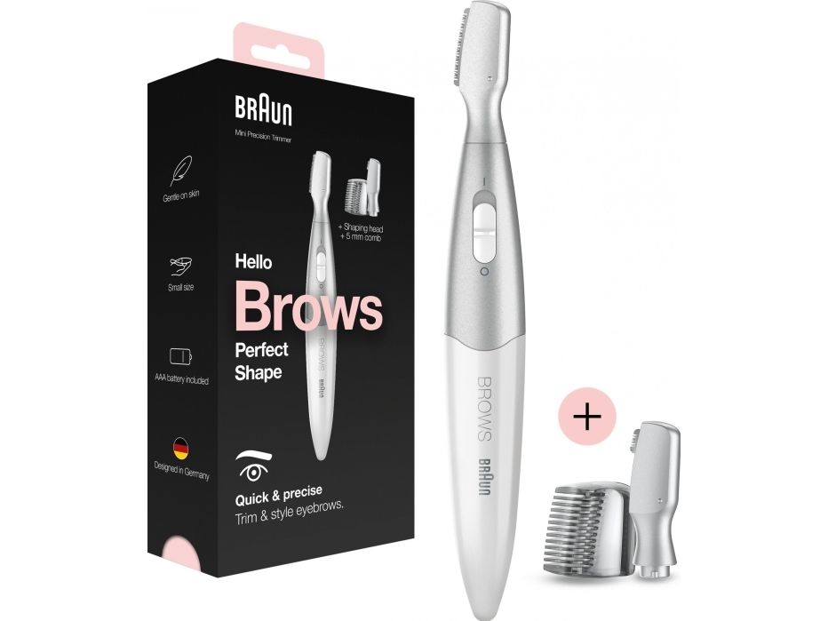 Braun FG1106. Precision trimmer purpose: Eyebrow, Face. Product colour: Silver, Country of origin: China. Power source: Battery, Battery type: AA. Safety warning: Conserver l’appareil au sec. N’utilisez pas l’appareil sur une peau irritée. Cet appareil.... Weight: 70.57 g
