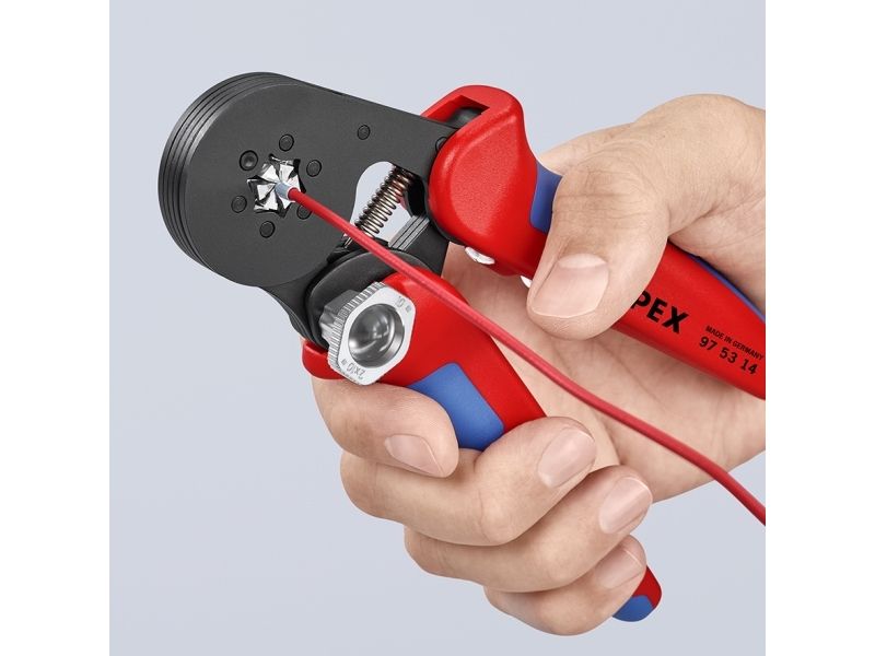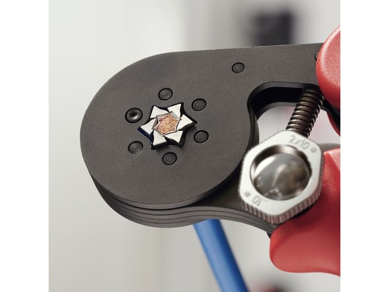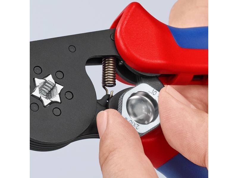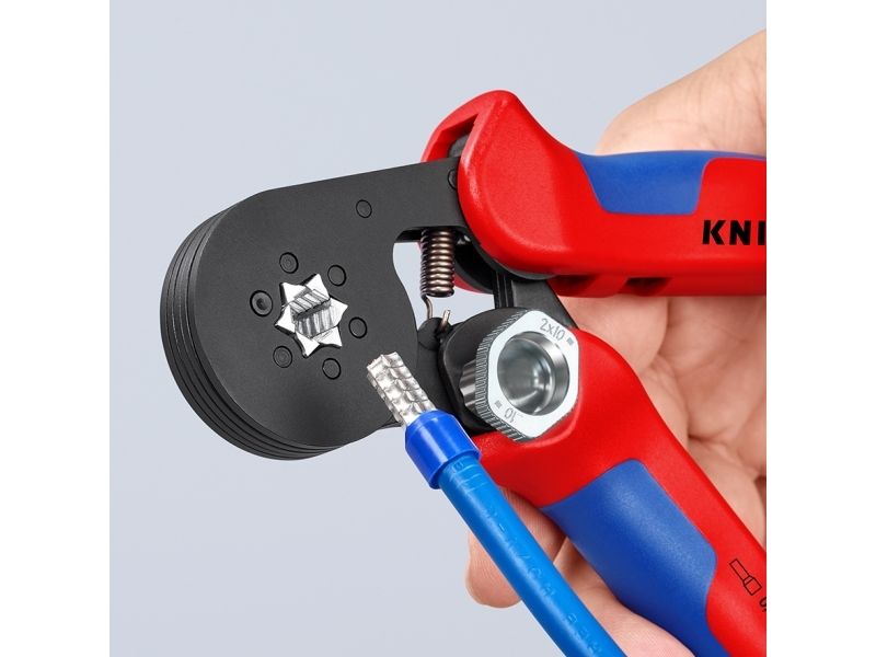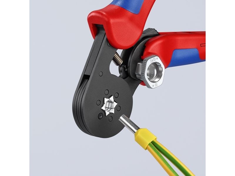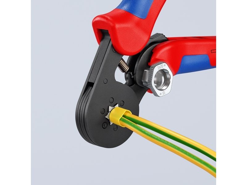 - Narrow handle width and improved ergonomics - For crimping wire end sleeves according to DIN 46228 parts 1 + 4 - Self-adjustment to the size of wire end sleeves required - Repetitive, high crimping quality due to integral lock (self-releasing mechanism) - Tools have been set precisely (calibrated) in the factory - Optimum transmission of force thanks to toggle lever for fatigue-reduced operation - Handy shape and low weight provide high operation comfort - Chrome vanadium electric steel in special quality, oil-hardened