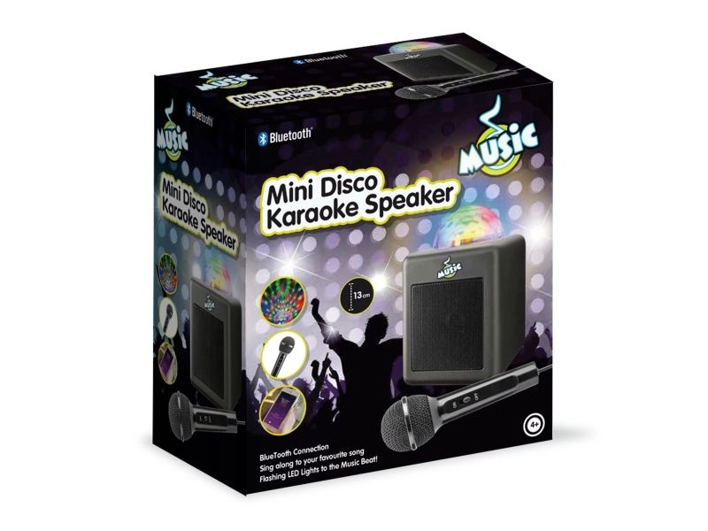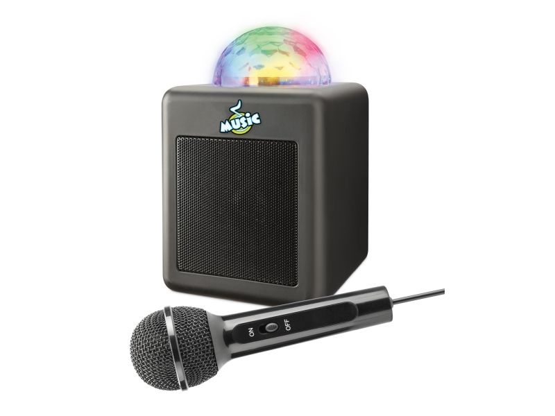 Microphone with echo function and speaker with flashing disco ball.