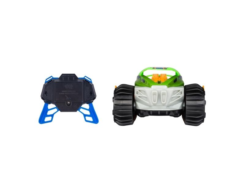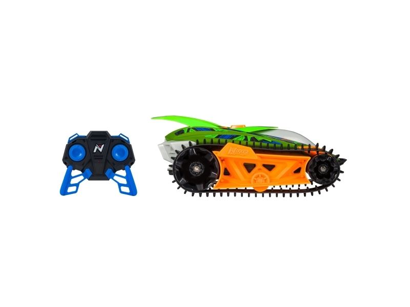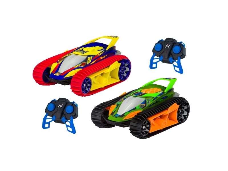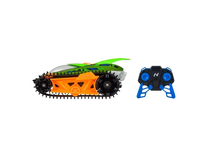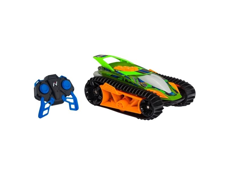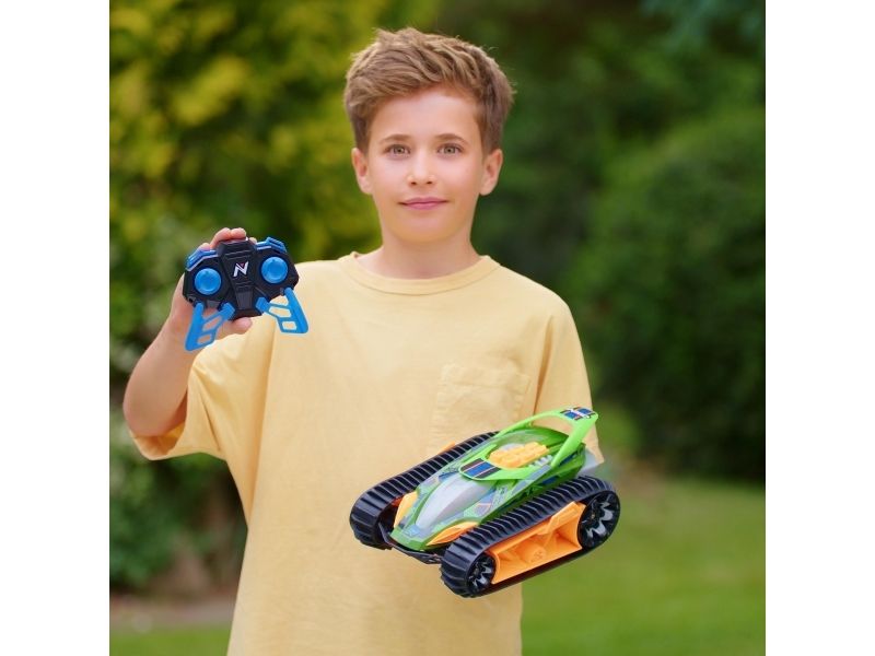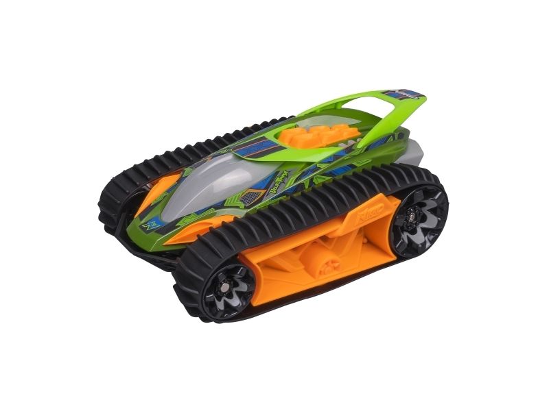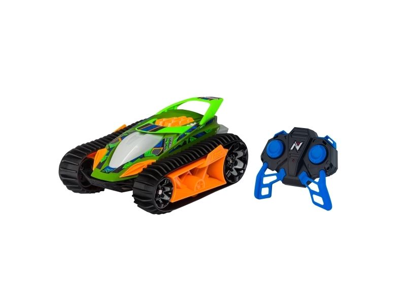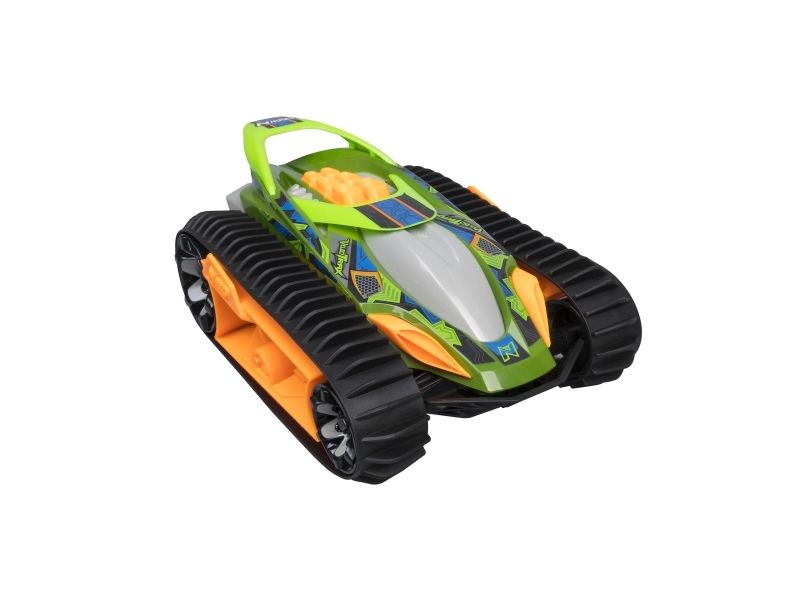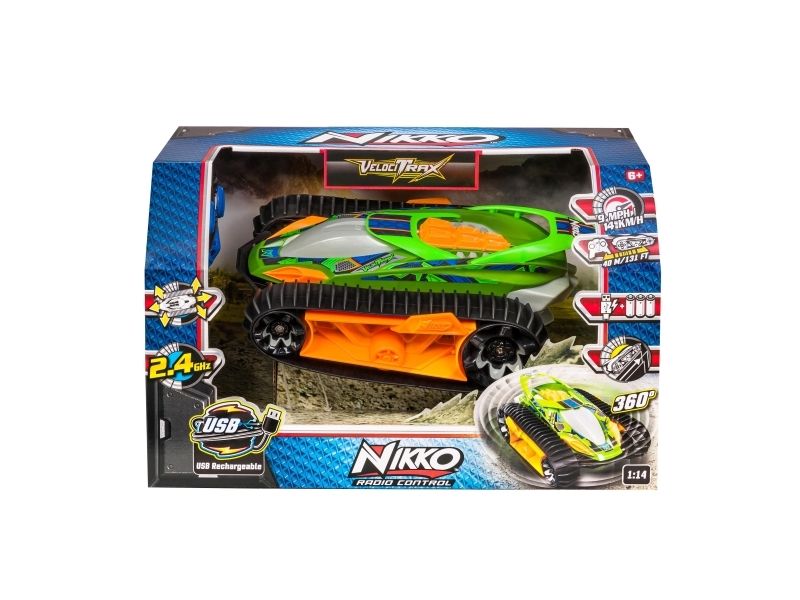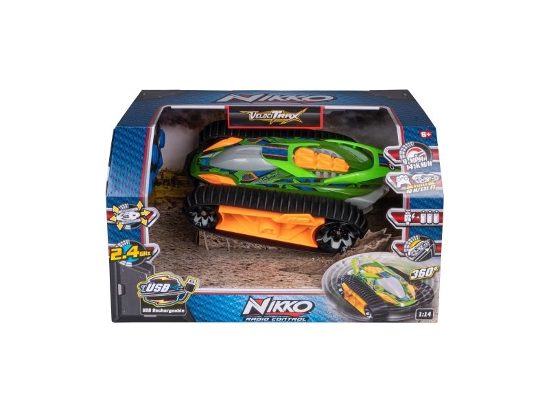 Superior traction for multi-terrain fun. Terrain and obstacles are no match for the VelociTrax R/C (2.4GHz)! This rugged vehicle has 360 degree spin capabilities, climbs 45 degrees, full-function remote control action and ultra-maneurability. No matter the conditions, the VelociTrax is ready! Reaches a speed of 14 km/hr. Range 40 m. The controller takes 3 x AAA batteries (included) and the vehicle 6.4V LiFePo4 battery included with USB charger. 1 hour charging time. From 6 years.
