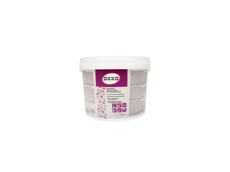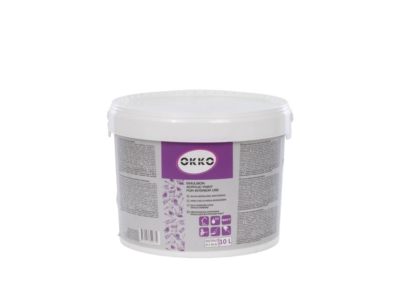 Brand- Okko. Quantity in package, l- 10. Paint type- Emulsion. Paint color- White. Shine- Matte. Resistance to wet scrubbing- 5 strength class. Thinner- Water. For finishing works- Indoor. Suitable for coating surfaces- , , Plasterboard, , , . Drying time (before repainting)- 2 - 2h. Additional information- Acrylic paints. The binder used in the paints is acrylic..