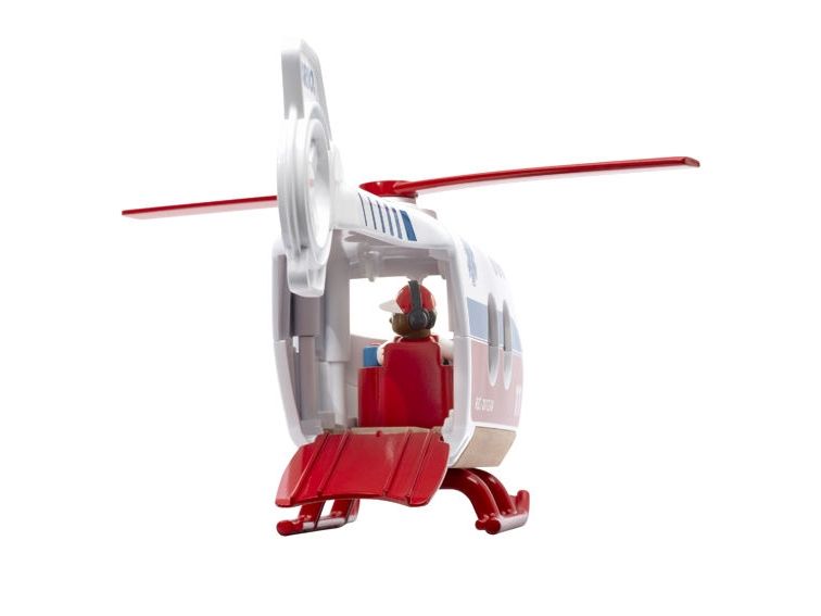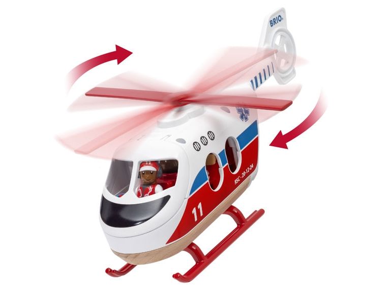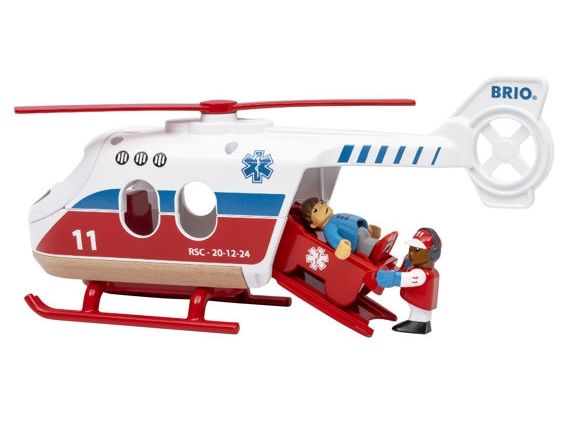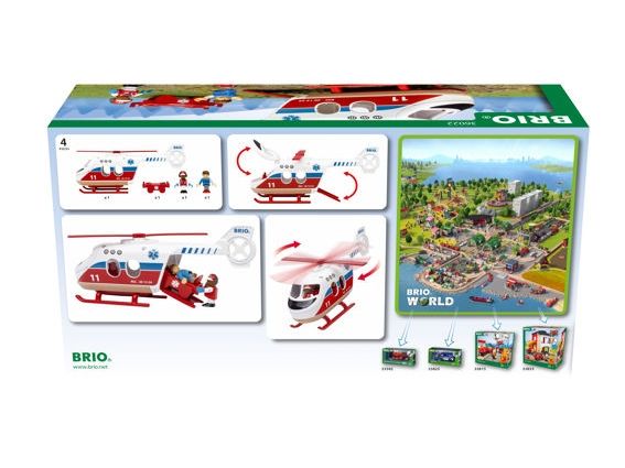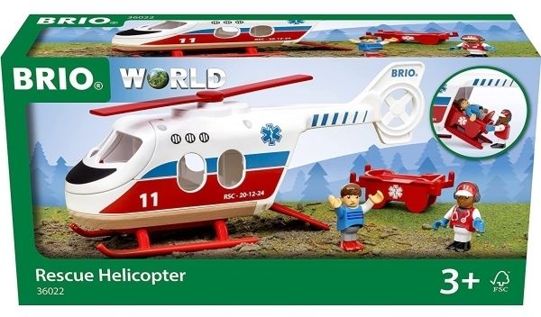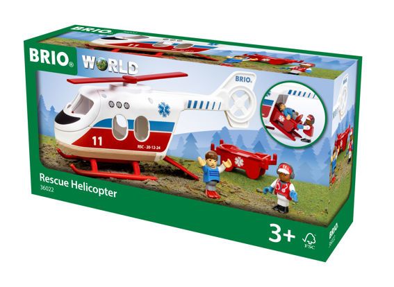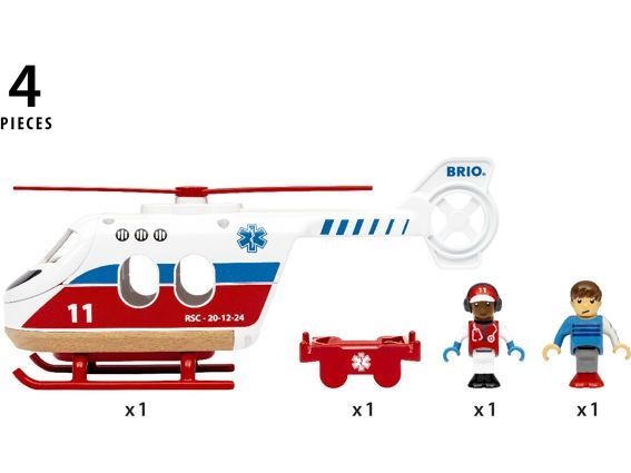 36022 Rescue Helicopter includes 4 pieces; 1x Rescue Helicopter, 1x Pilot Figure, 1x Patient Figure, 1x Stretcher Accessory.BRIO Rescue Helicopter. Product type: Helicopter, Recommended age (min): 3 yr(s), Product colour: Blue, Red, White