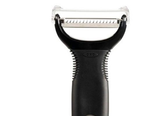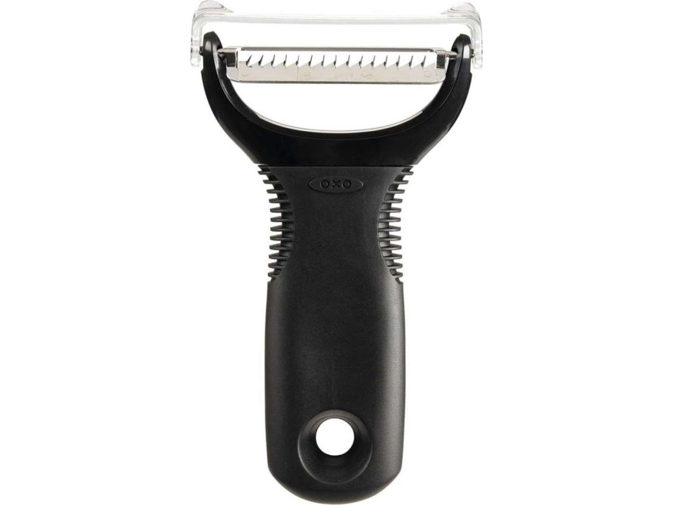 Create culinary sensations with the OXO Good Grips Julienne Peeler. With OXO's Julienne Peeler you can quickly and safely make garnishes, salad toppings, Asian dishes, citrus zest and more. Apply the sharp, stainless steel blade to firm fruits and vegetables such as zucchini, carrots, potatoes, apples or citrus fruit. When you begin to peel the fruit or vegetable, perfect julienne strips are cut. The clear safety cover flips out of the way while you peel, but locks back into place as a protective cover during storage.OXO 1054751v2. Product type: Straight peeler, Blade material: Stainless steel, Product colour: Black
