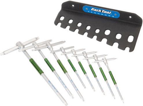Designed and built specifically for a wide variety of bicycle Torx® compatible work, the THT-1 is a set of eight common sizes of professional quality T-Handle star-shaped wrenches made for speed, efficiency, leverage and a perfect fit. Soon to become your favorite Torx® compatible set, the THT-1 includes a handy tool holder that mounts to any vertical surface, including pegboard and solid surfaces (fasteners not included).PARK TOOL THT-1. Torx key sizes: T10, T15, T20, T25, T30, T40, T6, T8, Product colour: Green, Grey. Number of pieces: 9 pc(s)
